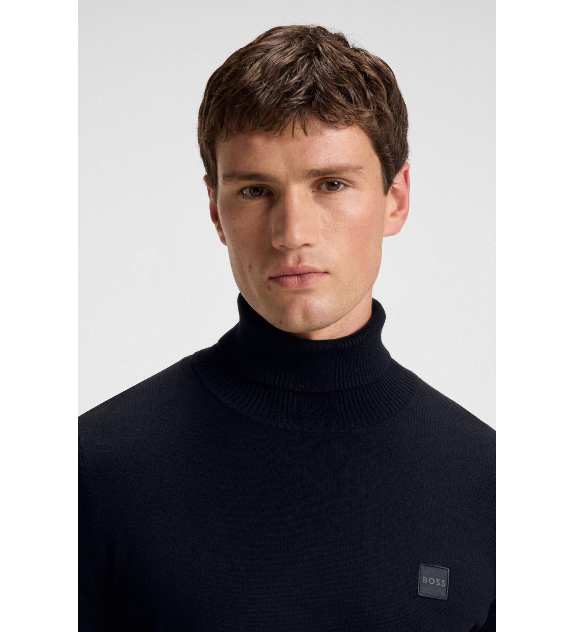Vælg komfort med denne BOSS herretrøje med rullekrave i bomulds- og kashmirstrik. En logopatch på brystet fuldender stilen.