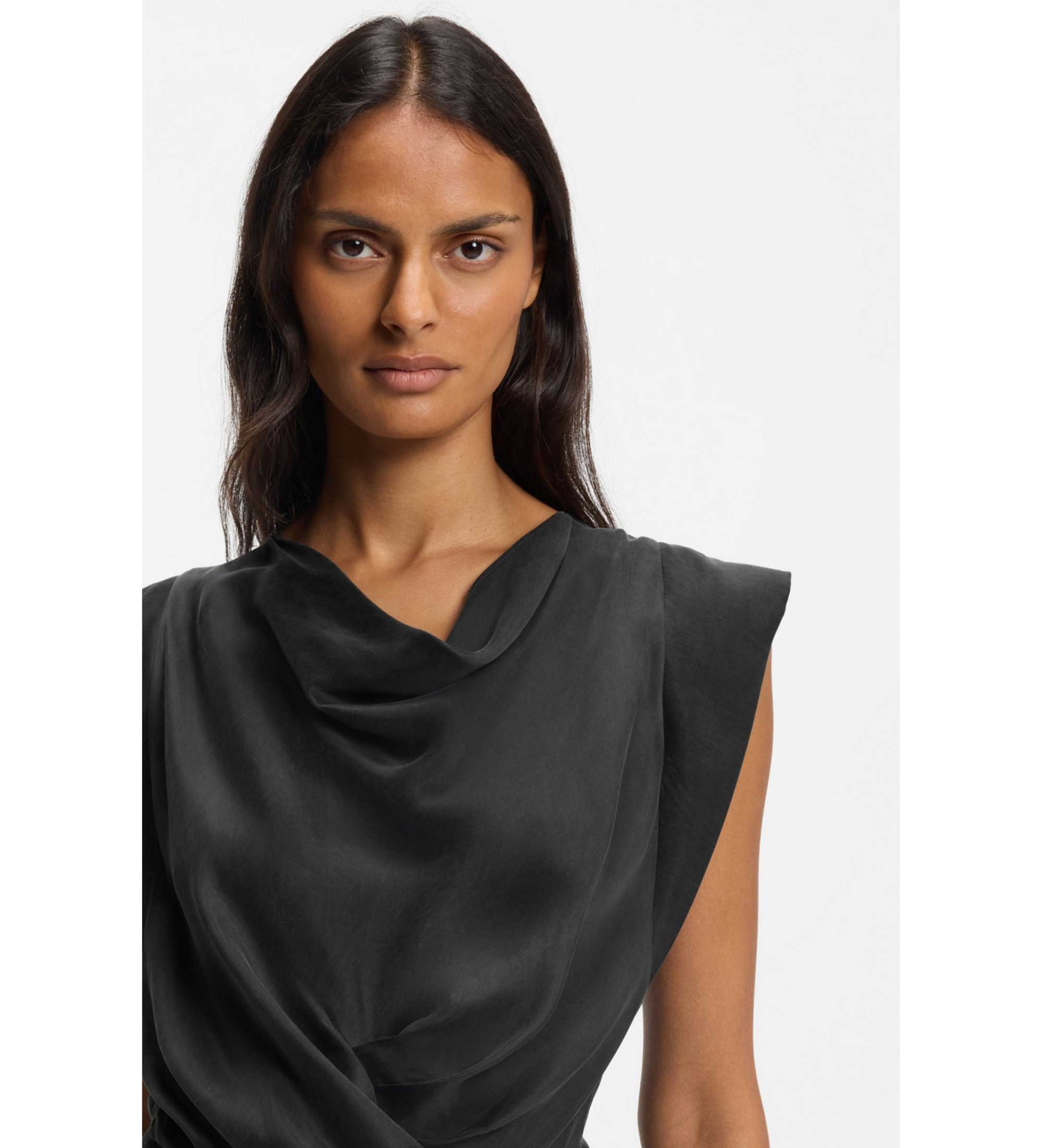 Skab et afslappet look med det flydende stof, den draperede halsudskæring og crossover-nederdelen på denne BOSS Womenswear-kjole. Usynlig lynlås bagpå.