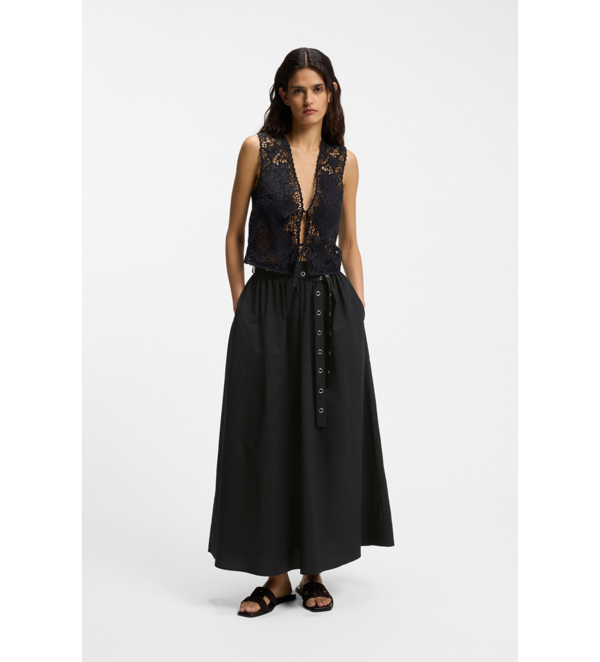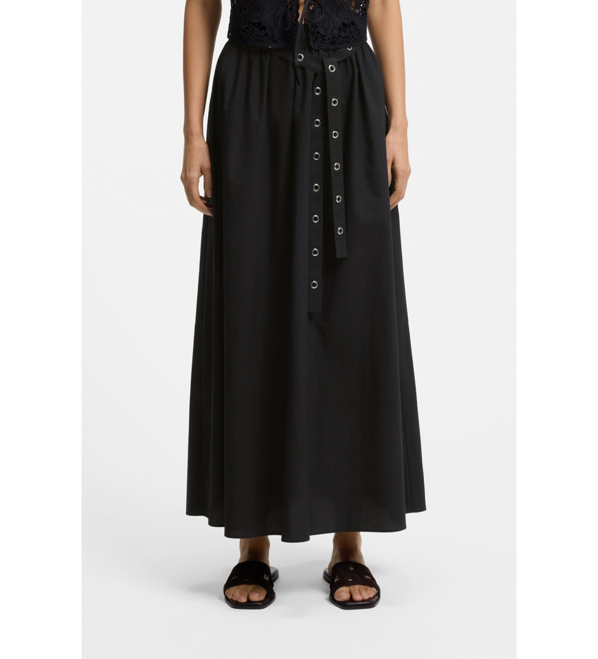 Denne maxi-lange BOSS Womenswear-nederdel er fremstillet i behagelig blød bomuldspoplin. Aftageligt bælte med trendy gennembrudte detaljer.