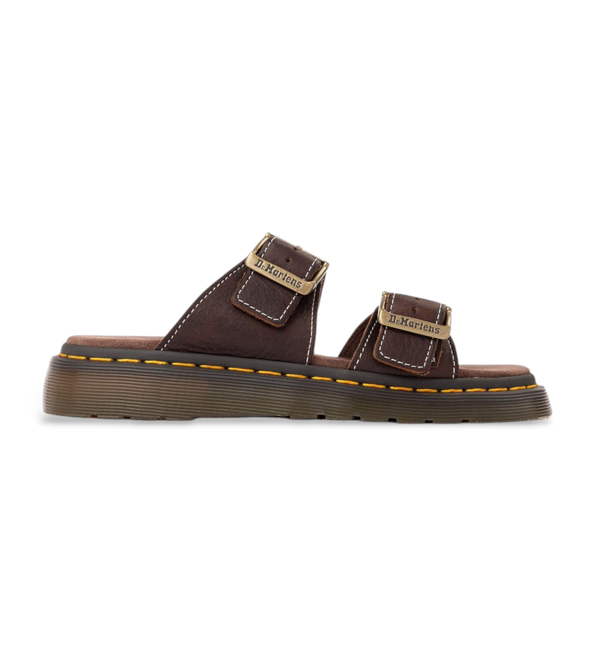 En sandal med dobbeltrem i mørkebrunt læder, der er indbegrebet af Dr. Martens' rebelske attitude og sommerlige håndværk. De antikke metalspænder og de umiskendelige gule syninger på sålen bidrager til det britiske mærkes autentiske og genkendelige karakter. Komforten ved en åben sandal er kombineret med den soliditet og ikoniske stil, der definerer alle mærkets designs.