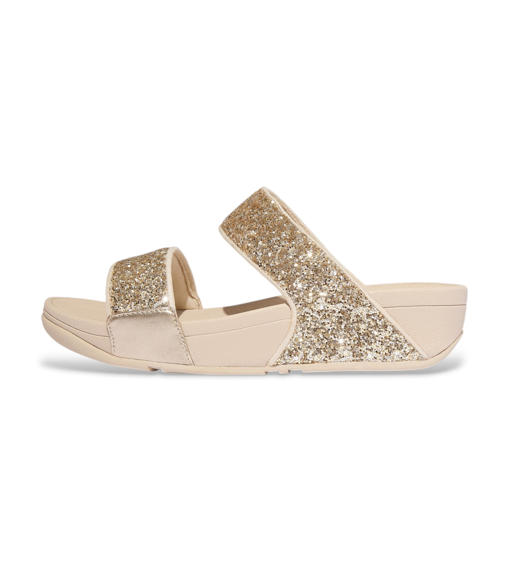 FitFlops Lulu Slide med multitonal glitter: partikler i forskellige størrelser og finish bryder lyset i nuancer, der ændrer sig afhængigt af vinklen. En sommerbasker med mere kompleksitet, end man umiddelbart skulle tro, på en mellemsål af Microwobbleboard, der altid garanterer det vigtigste.