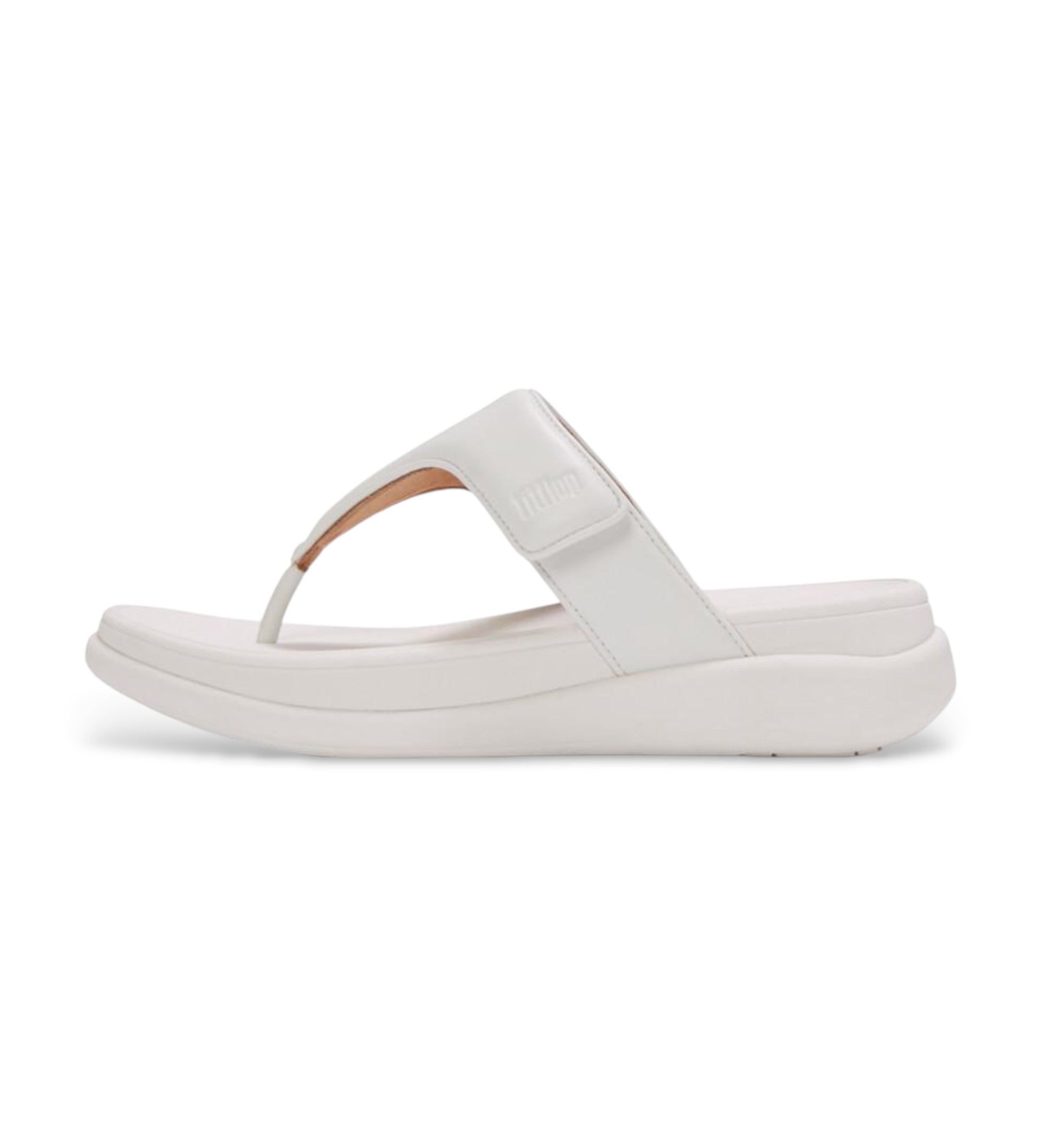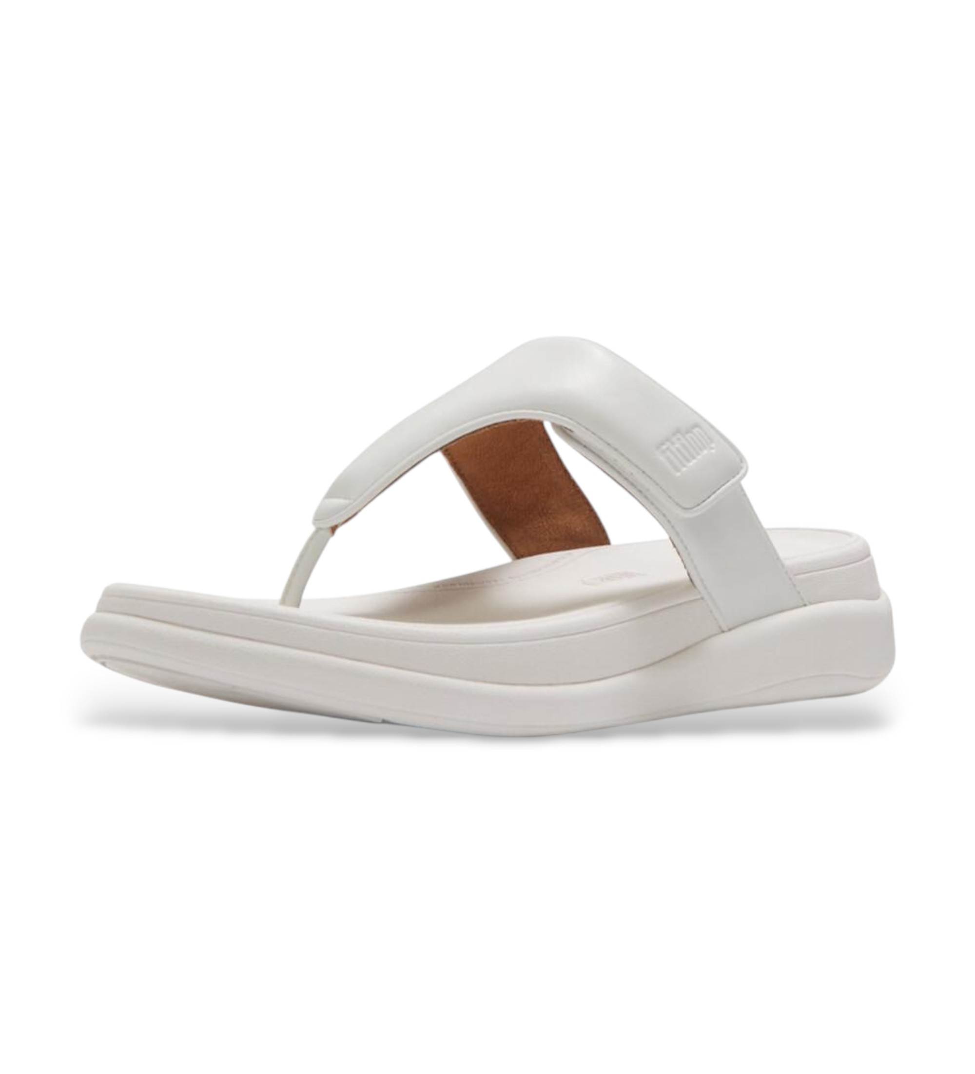 FitFlop flip flop-sandal i hvid med bred polstret rem og ergonomisk plateausål. Et sommerligt og sofistikeret stykke, der kombinerer mærkets karakteristiske komfort med et minimalistisk og raffineret design til et elegant strand- og bylook.