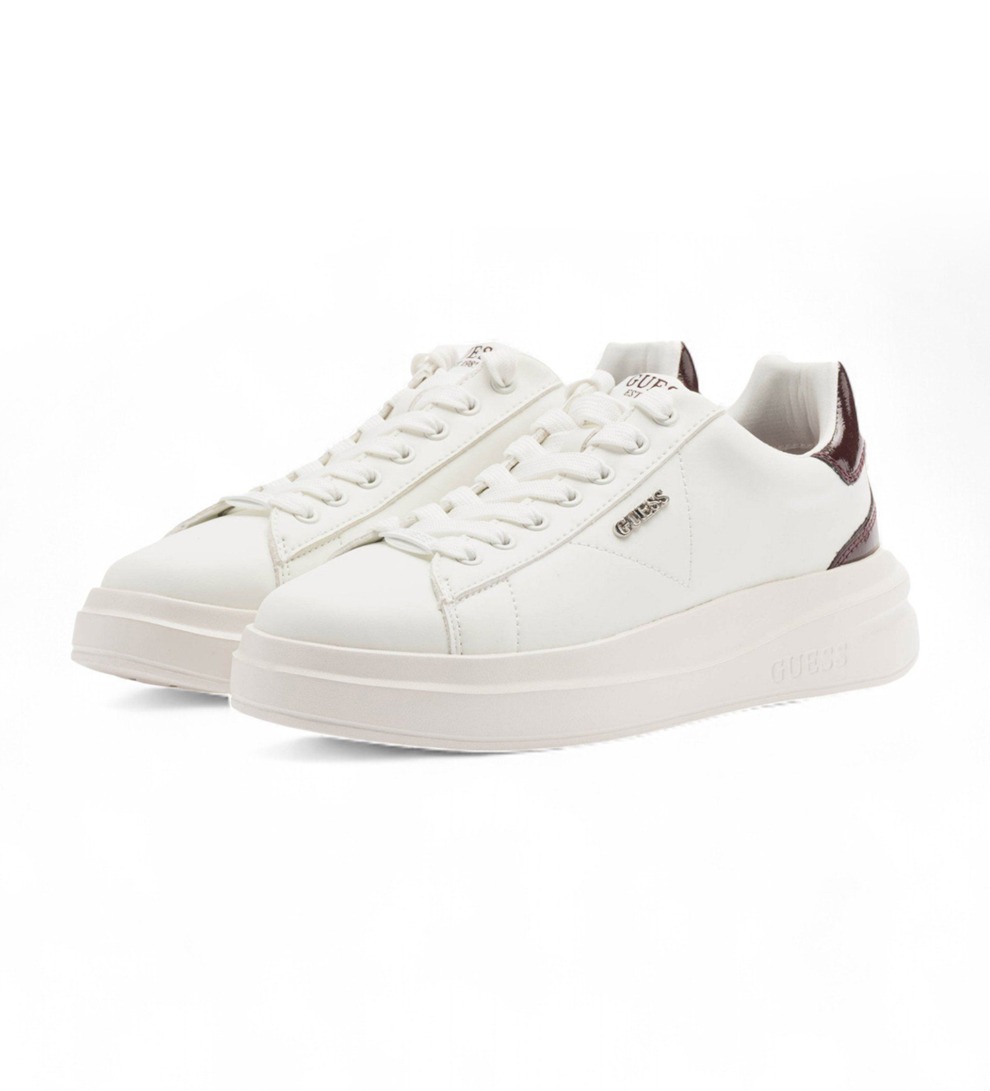 Træningssko i glat kalveskind med hældetalje. De har Guess-logoindsatser og -finish, som giver et karakteristisk, moderne touch. Designet har et præget Guess-logo på siden, tonede syninger og kanter og en læderpløs med mærke.