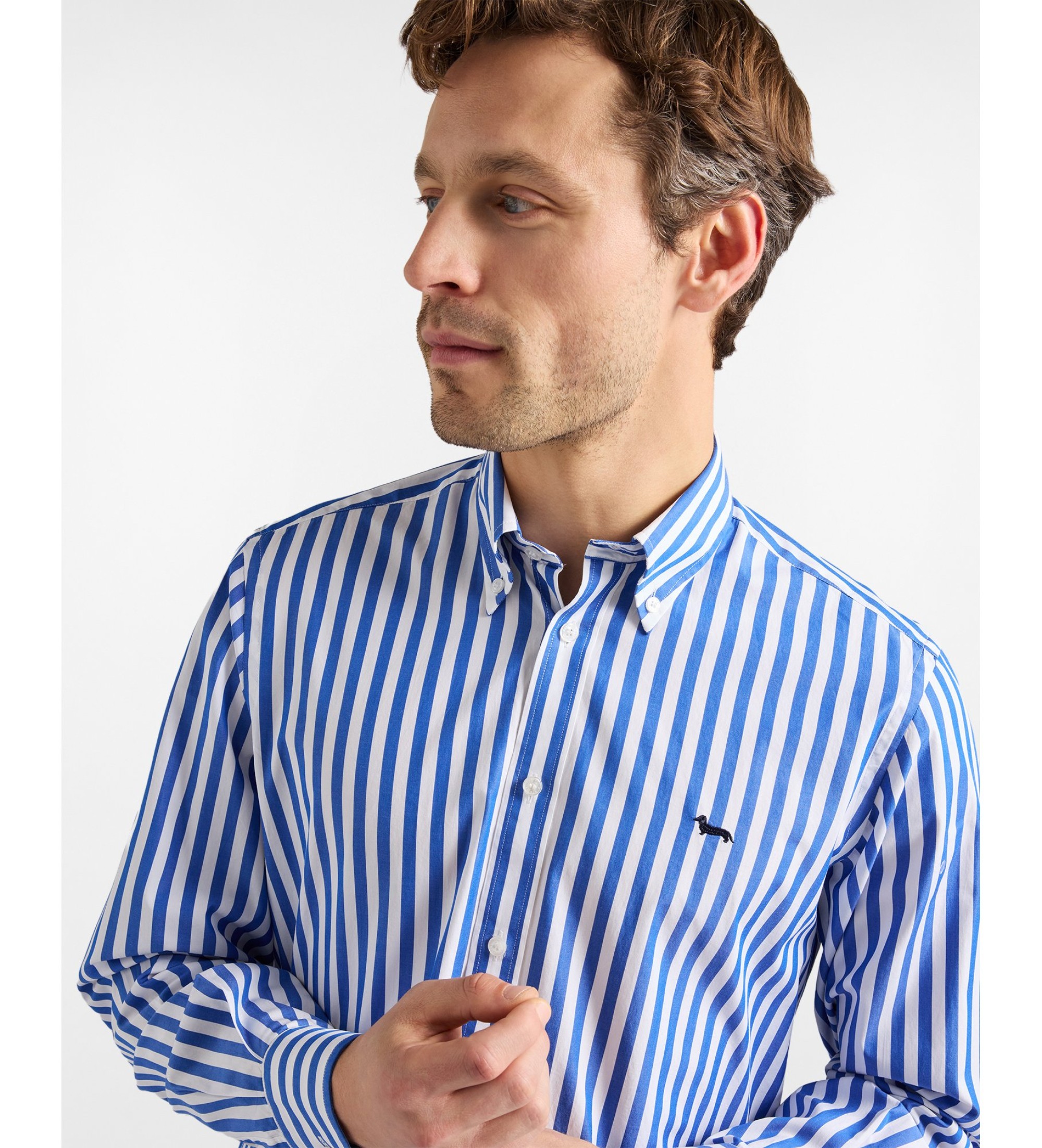 Denne Harmont & Blaine-herreskjorte er fremstillet i cool, åndbar garnfarvet, stribet poplin og har et all-over lodret stribet print og den ikoniske gravhund broderet på brystet. Denne beklædningsgenstand er en del af Sorbetto-kollektionen: et udvalg af produkter, der er skabt ved at genfortolke de ikoniske H&B-striber i nye variationer. Standard snit, button-down krave og plisseret bærestykke bagpå.