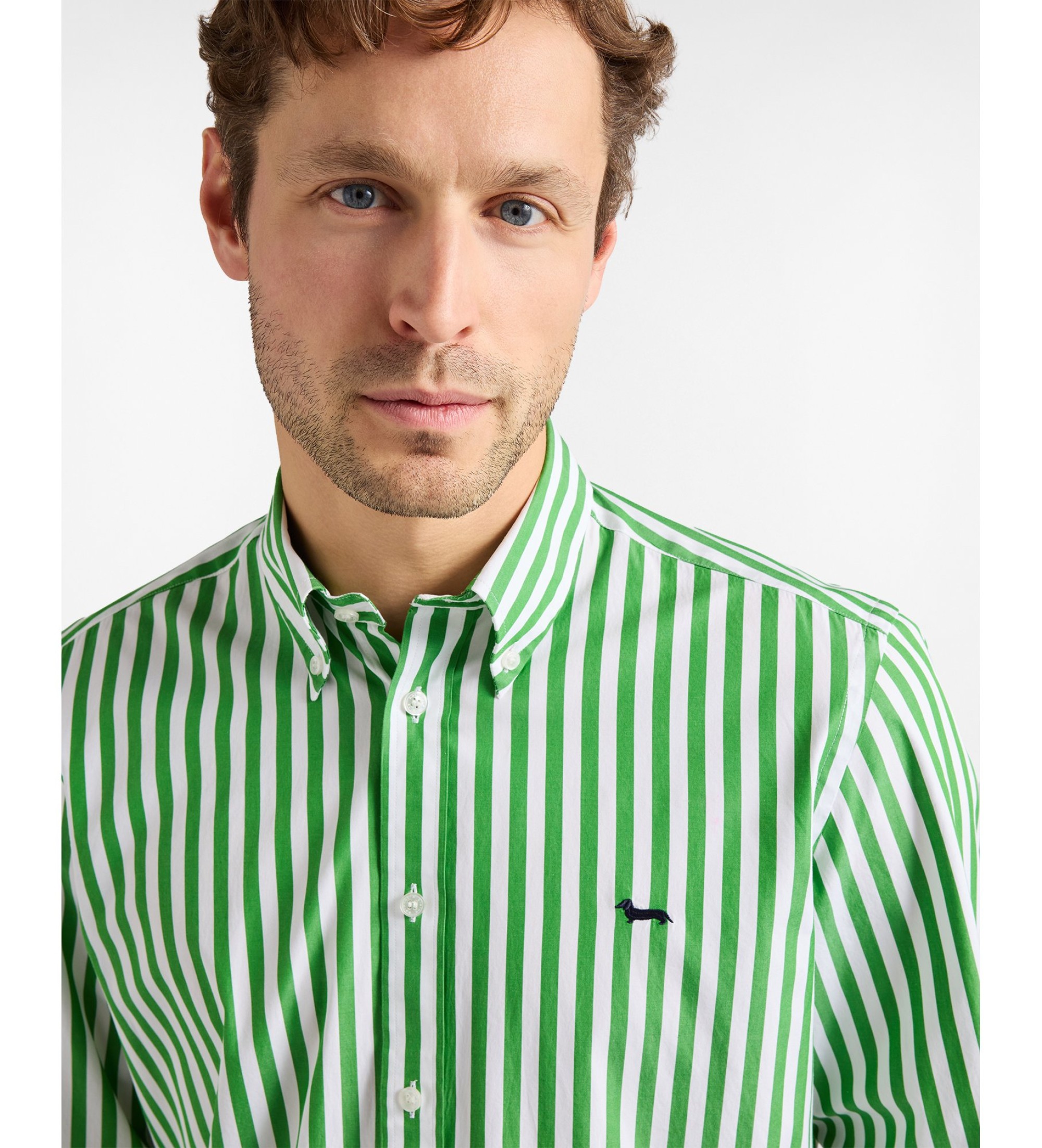 Denne Harmont & Blaine-herreskjorte er fremstillet i cool, åndbar garnfarvet, stribet poplin og har et all-over lodret stribet print og den ikoniske gravhund broderet på brystet. Denne beklædningsgenstand er en del af Sorbetto-kollektionen: et udvalg af produkter, der er skabt ved at genfortolke de ikoniske H&B-striber i nye variationer. Standard snit, button-down krave og plisseret bærestykke bagpå.