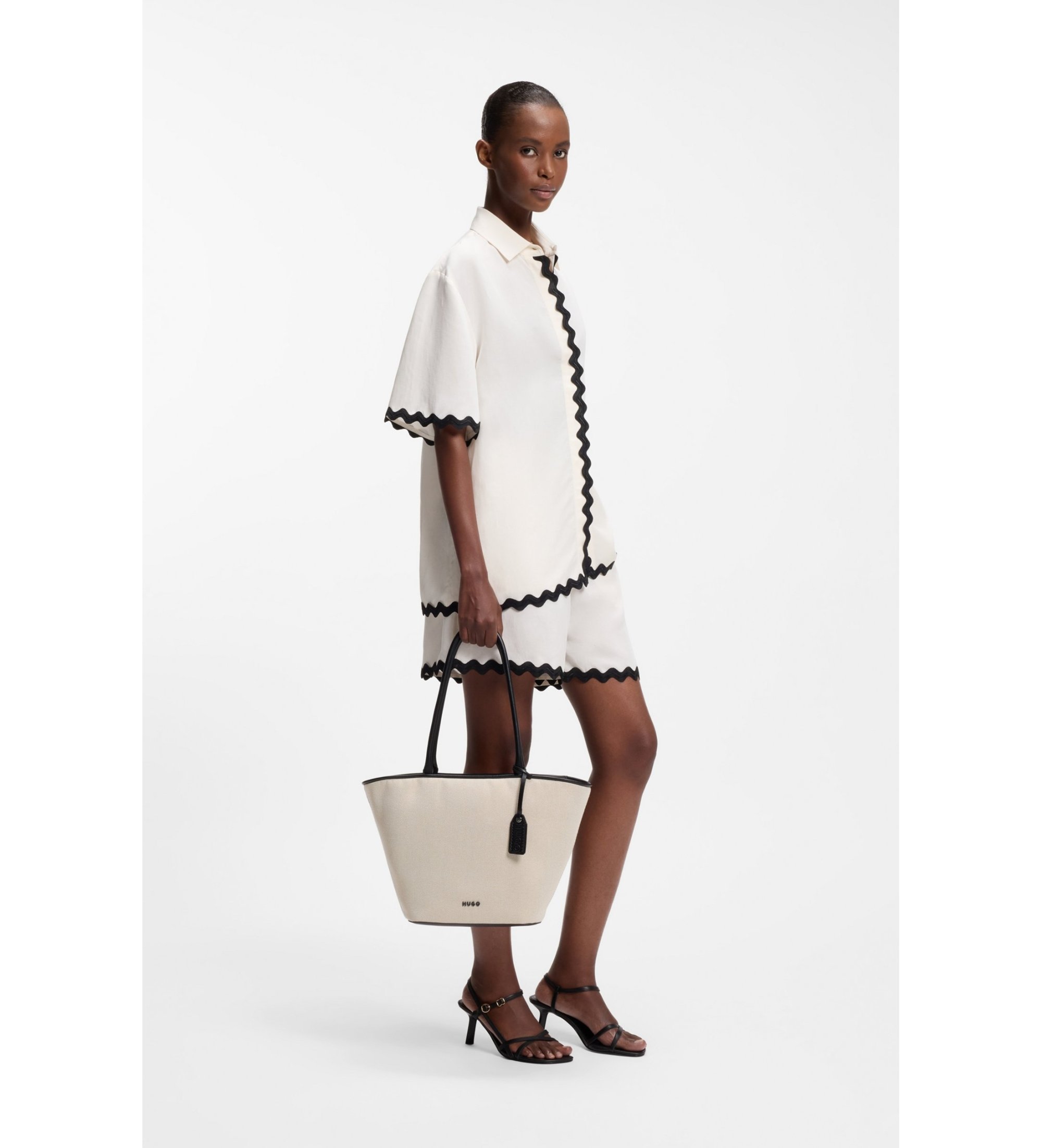 Denne HUGO Woman-taske er fremstillet i struktureret kanvas med belagte syntetiske kanter. Sort mærke og logobogstaver. Belagt syntetisk stof, også kaldet "syntetisk læder", er et stof, der er designet til at ligne ægte læder eller til at have en mat, blank, glat eller struktureret finish.nbsp;Størrelse: 26 x 45 x 11 cm.