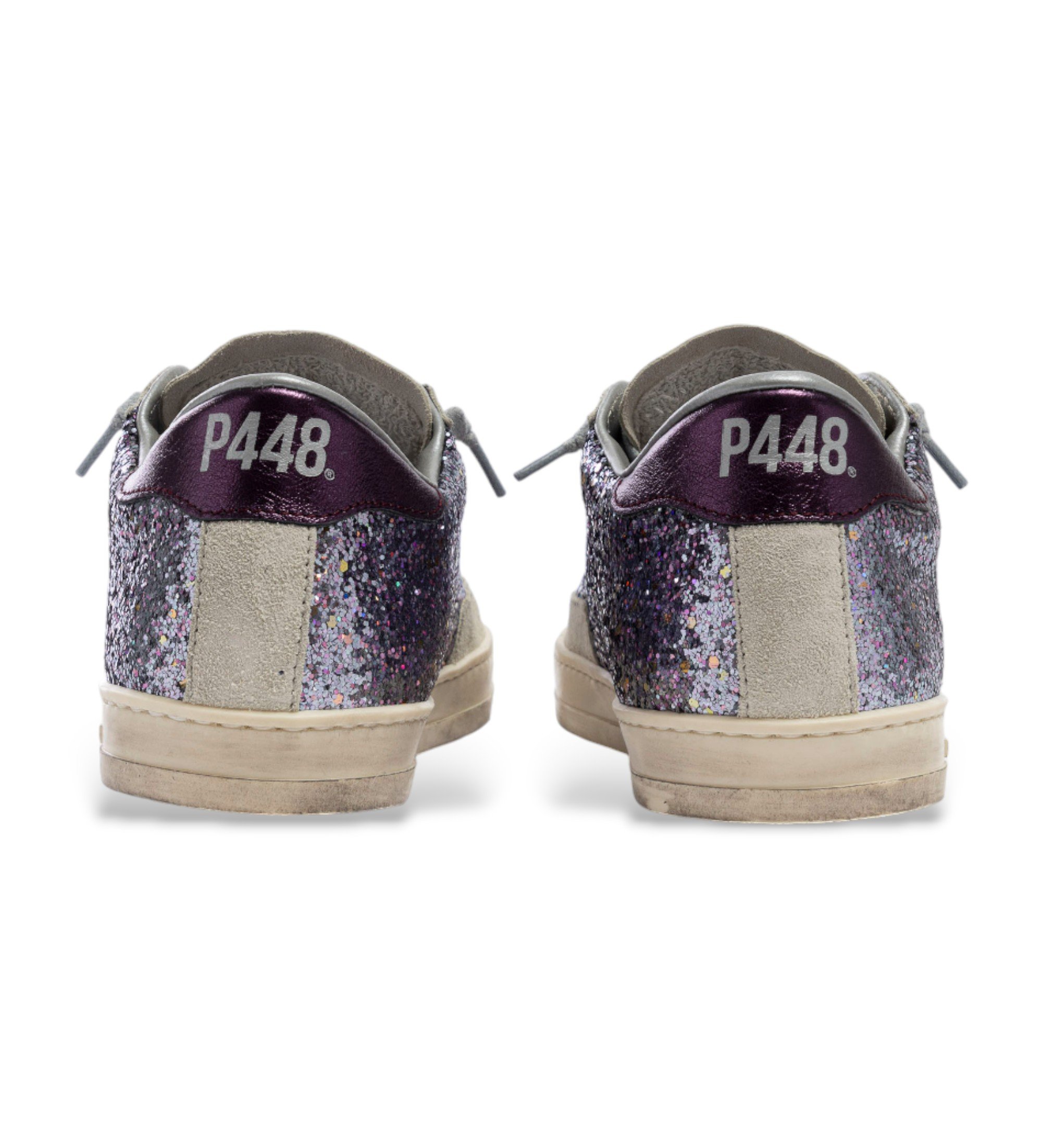 John Glitter/Purple er indhyllet i skinnende lyslilla glitter med detaljer i beige ruskind og en matchende lilla metalhælkappe. Grå bomuldssnørebånd og vores karakteristiske håndslidte, sortmønstrede P448-gummisåler fuldender looket.