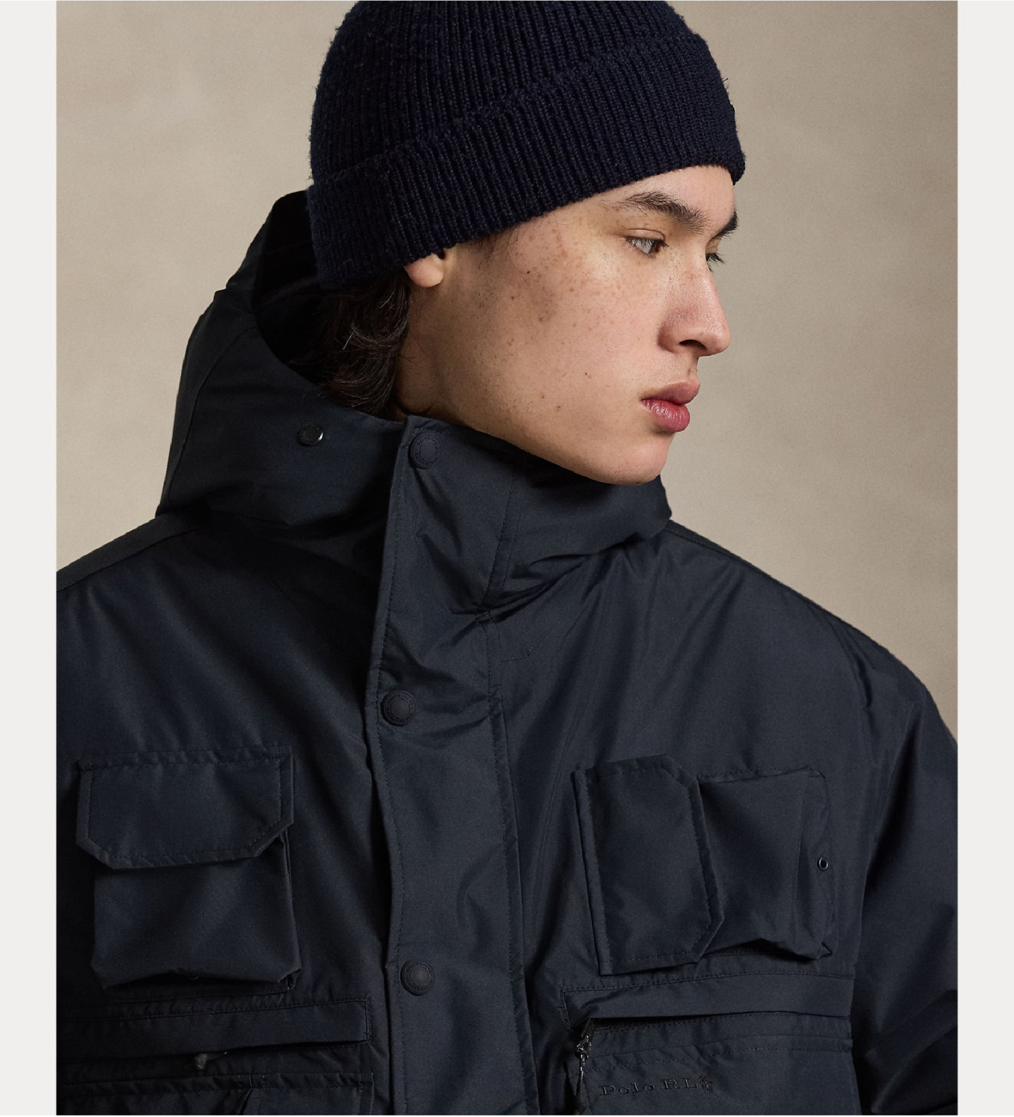 Denne beklædningsgenstand er inspireret af traditionelle fiskejakker og kombinerer form og funktion med en vandafvisende stofkonstruktion i to lag og isolering med dun. Indvendigt med tapede sømme og flere funktionelle lommer.