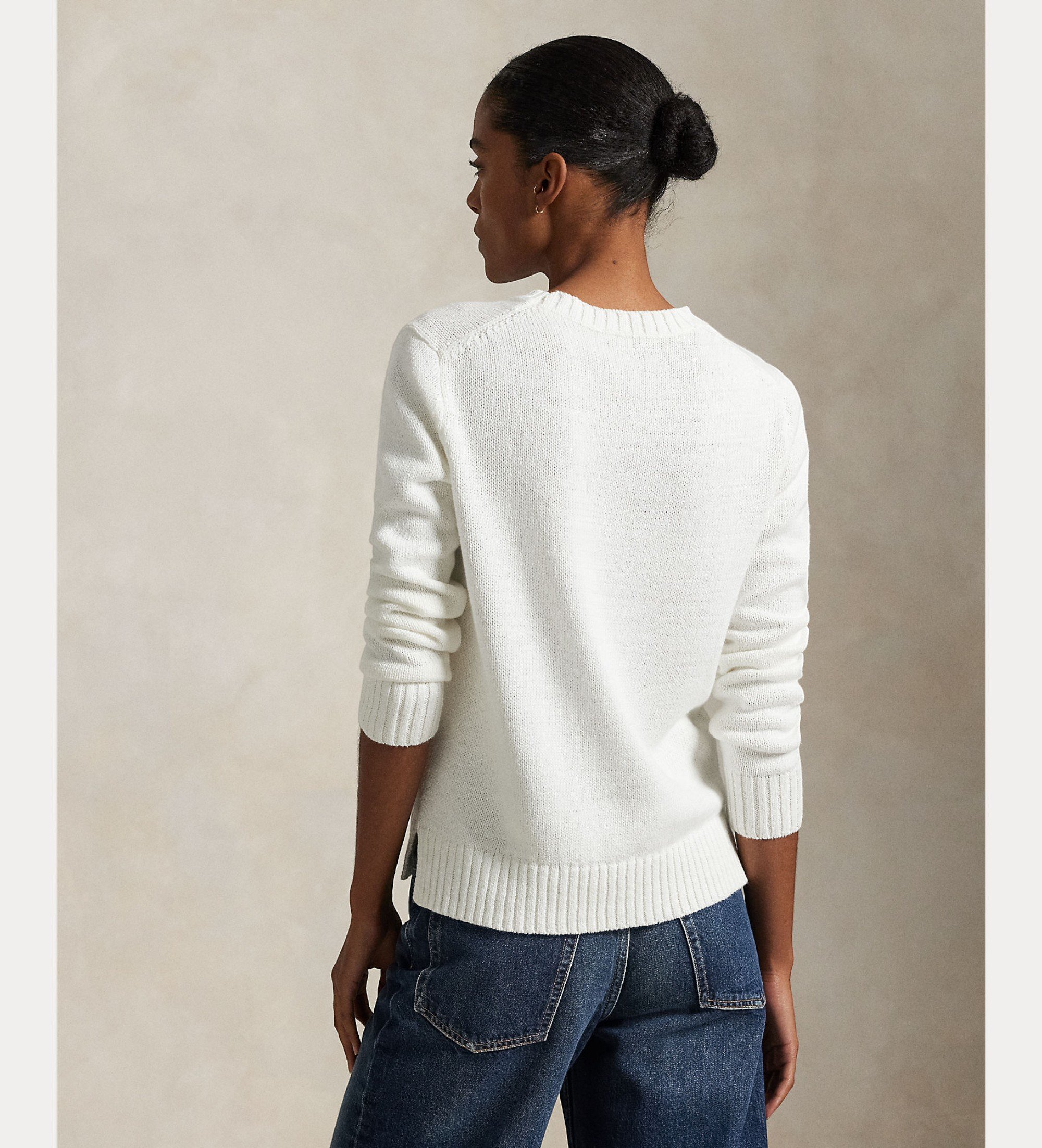 Denne trøje med rund hals i bomuld og hør har Polobjørnen klædt i Ralph Laurens signaturlook broderet med intarsiasting.