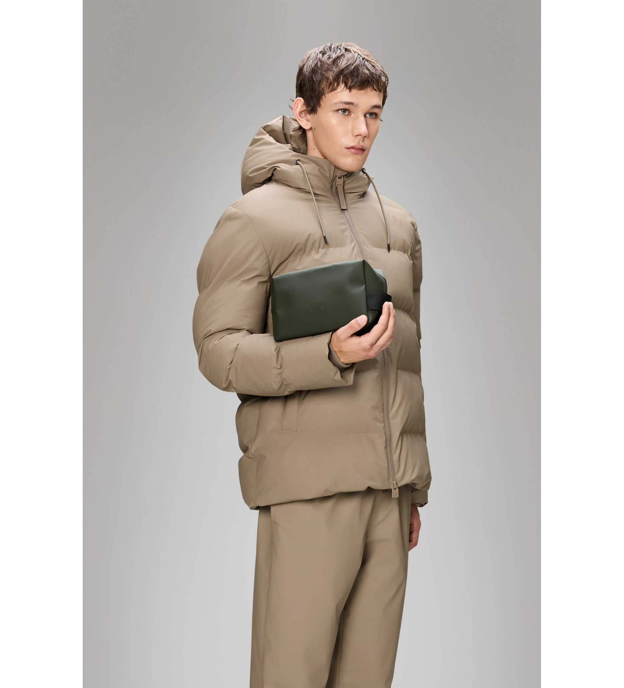 Wash Bag Small er fremstillet af Rains' karakteristiske vandtætte PU-stof, der er designet til at give robust bærestyrke, holdbarhed og en glat finish.