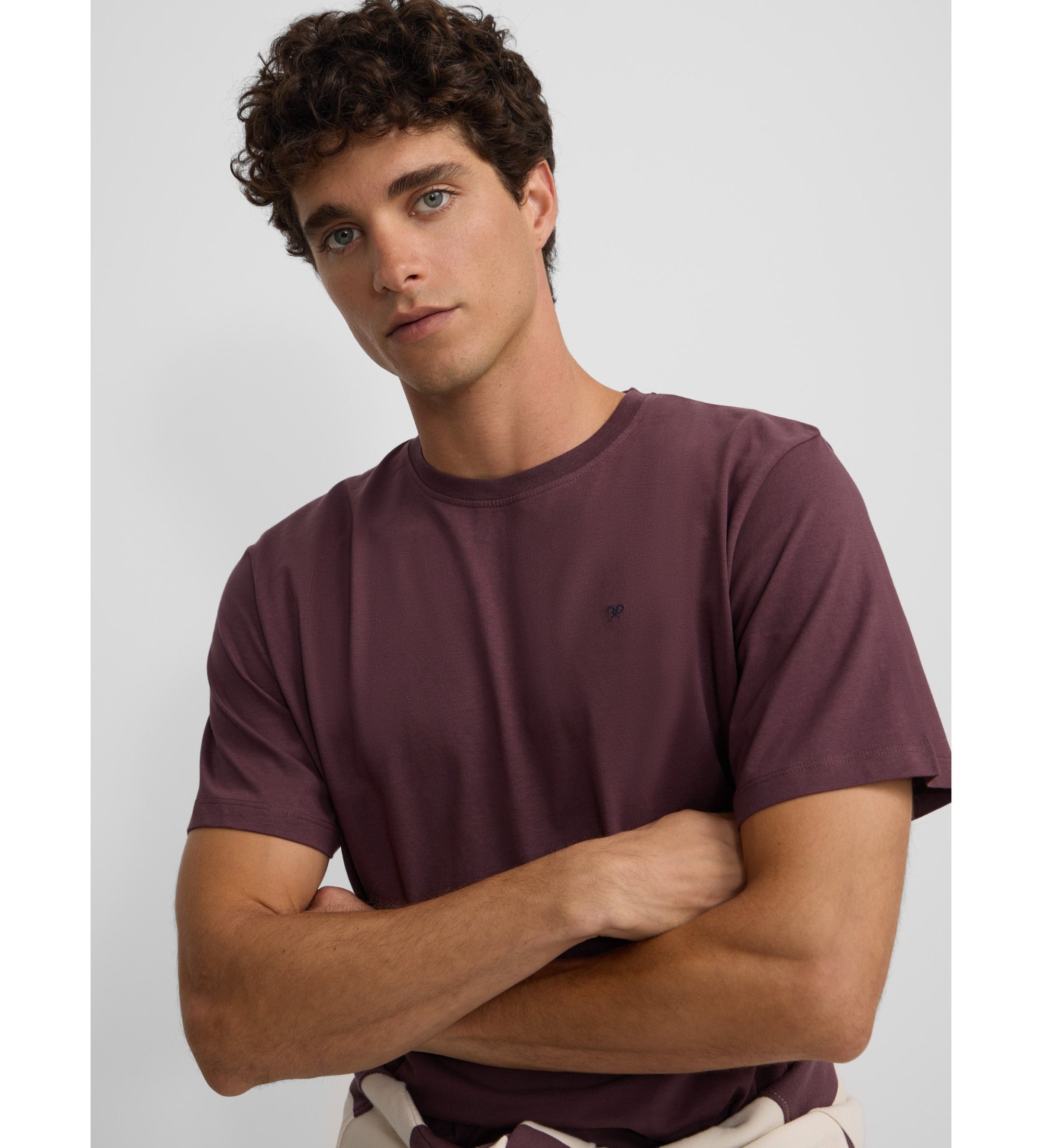 Bourgognefarvet kortærmet T-shirt i 100% bomuld med almindelig pasform. Har rund hals. Med kontrastfarvet marineblåt ketsjerbroderi på overkroppen.