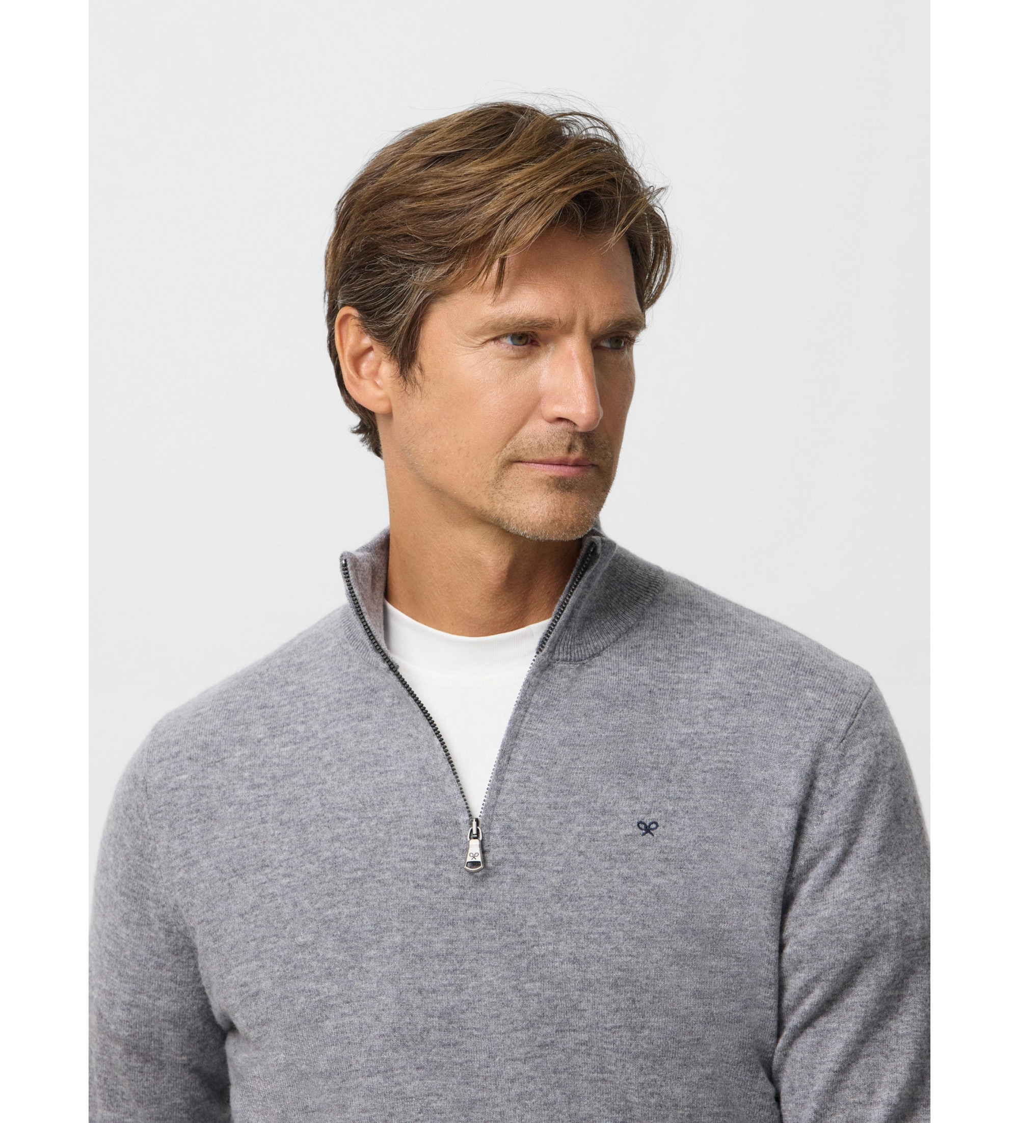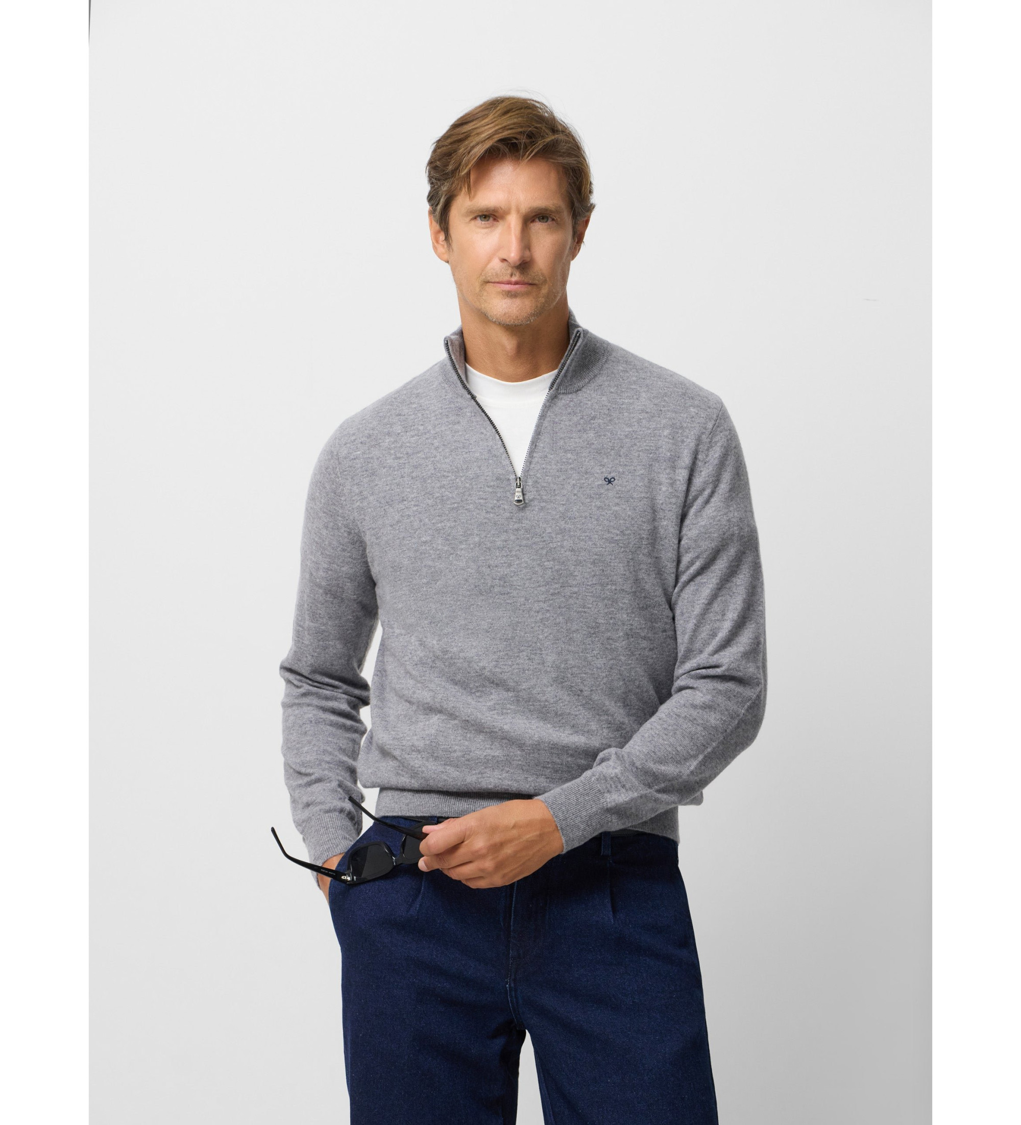 Ensfarvet grå jumper i uldblanding med almindelig pasform. Den har en opretstående krave, en halv lynlås med personlig trækfane og lange ærmer. Den har broderede ketsjerdetaljer på overkroppen i marineblå.