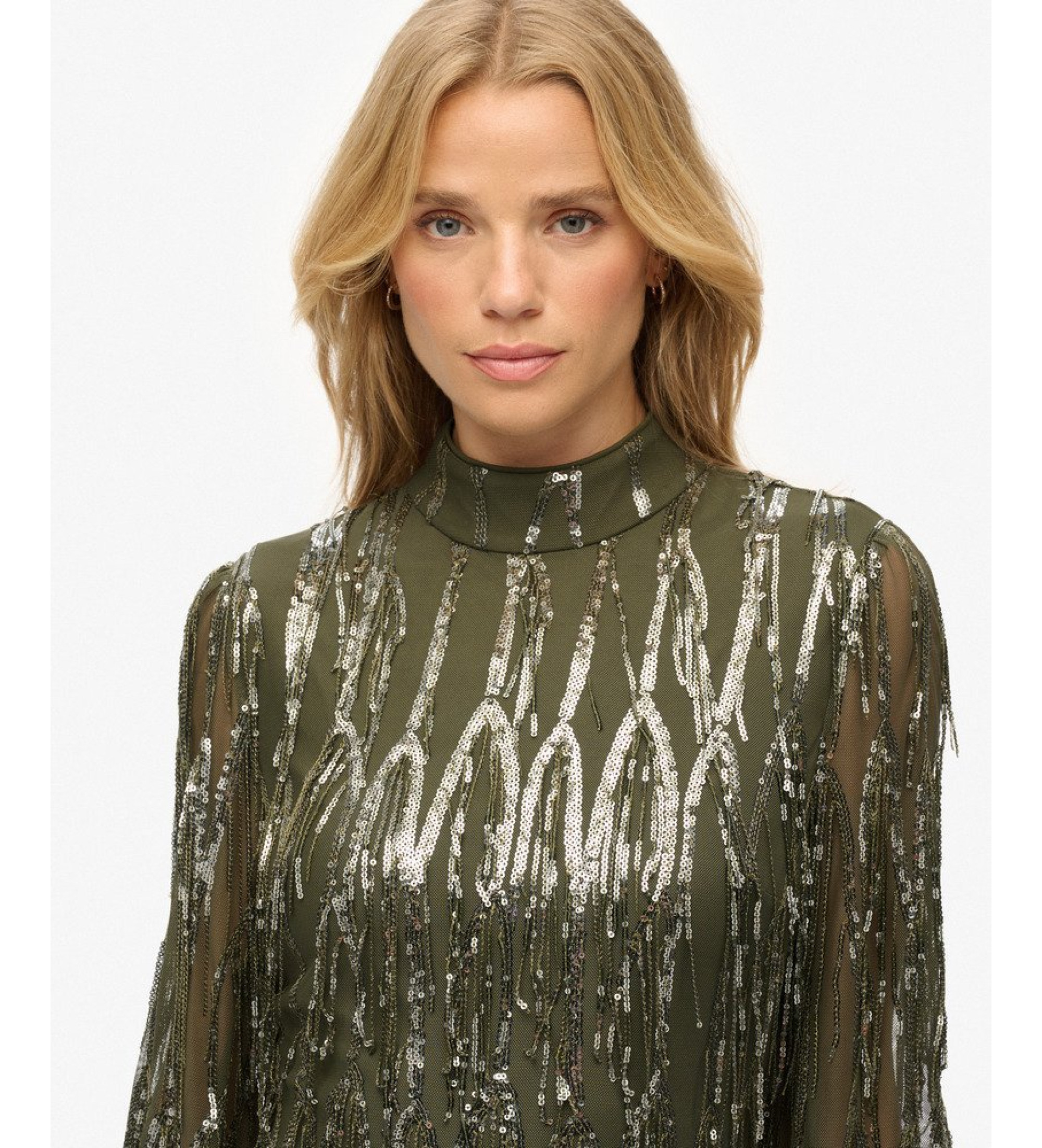Denne minikjole er det perfekte valg til at stråle til dine særlige begivenheder. Den har en figurflatterende, slank pasform og et design med pailletter og frynser, som giver en unik og iøjnefaldende dynamik. Den høje krave og de lange, udspilede ærmer tilføjer et strejf af elegance og raffinement. Den skjulte lynlås bagpå sikrer en perfekt pasform. Et must-have til festsæsonen.
