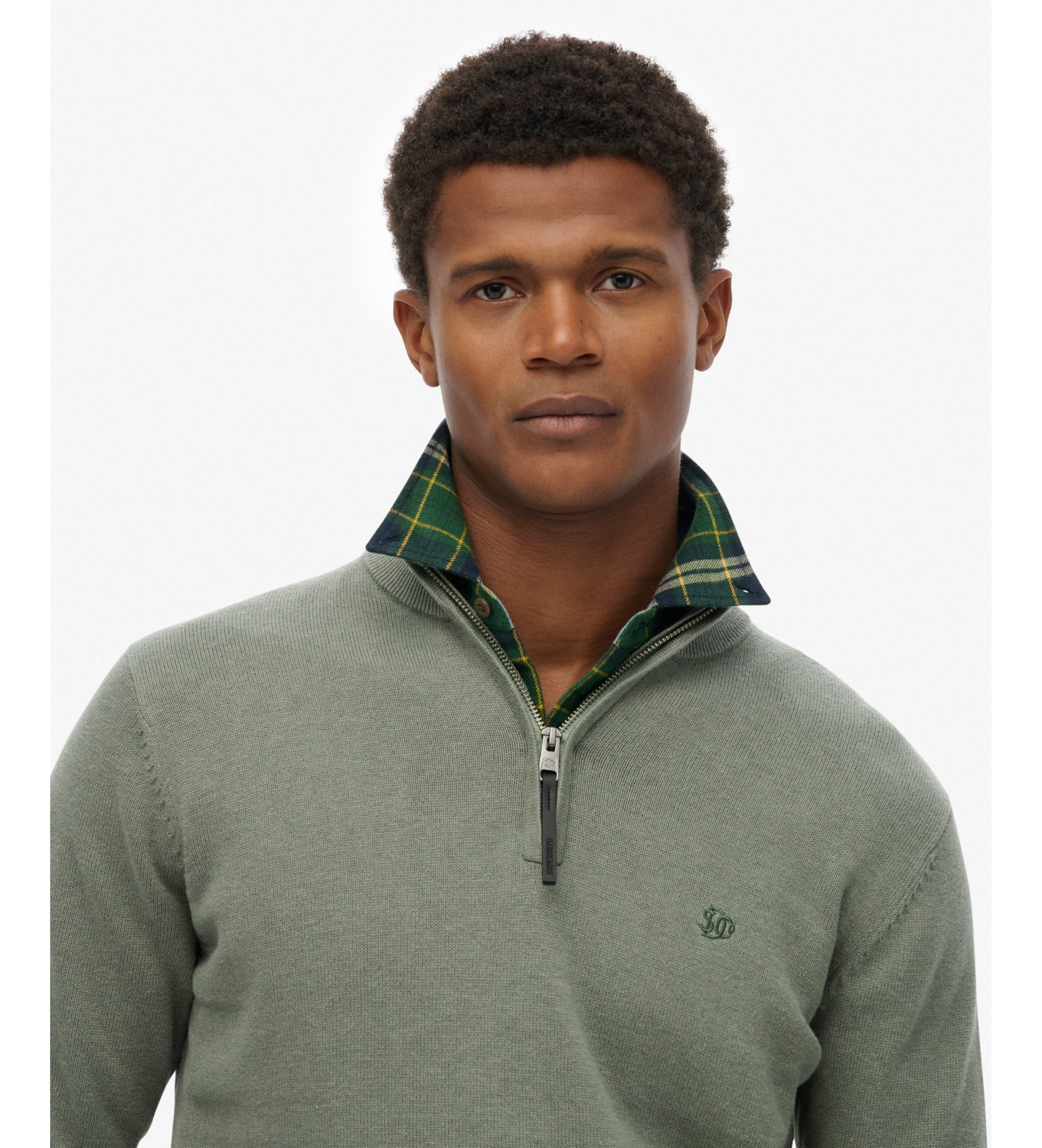 En slim-fit jumper til mænd i en rolig grøn nuance. Den er fremstillet af 100 % bomuld og har et fyldigt, overdådigt stof, der giver blødhed og struktur. Den har en halv lynlås med ribkanter og et diskret broderet logo på brystet, hvilket øger dens alsidighed. Denne basistrøje er uundværlig i en moderne garderobe og kan løfte et afslappet look med naturlig lethed.