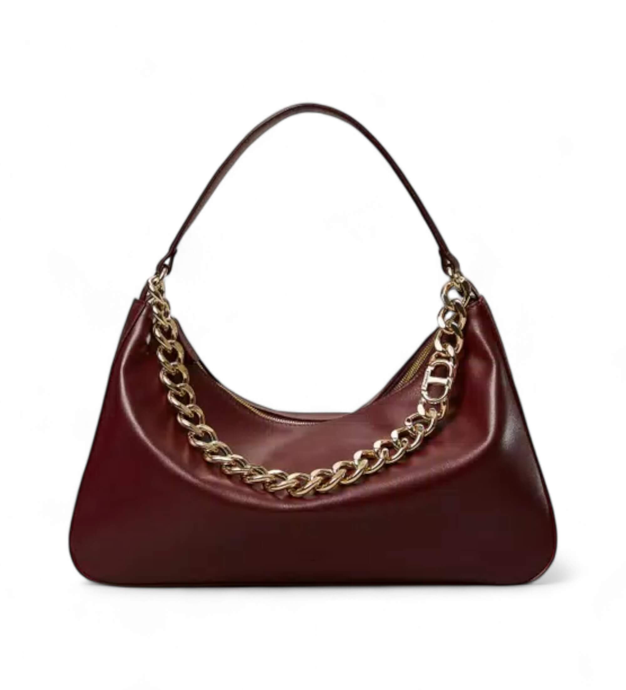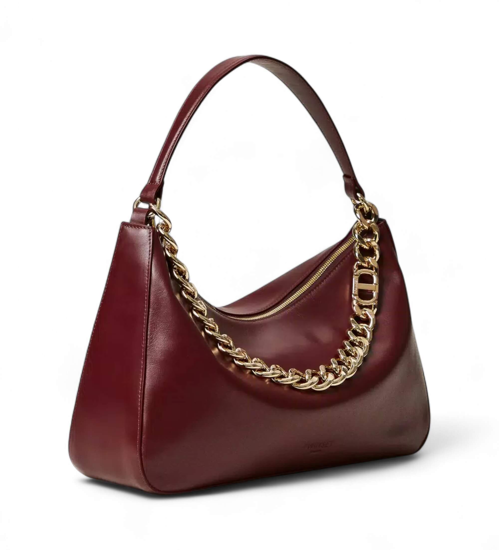 Liliane" hobotaske fremstillet i Italien i fuldnarvet, glat kalveskind med vandtæt og ridsefast behandling. Kroppen er søjleformet, har et varmstemplet logo og er foret med blandet bomuldstwill. Den har to aftagelige hanke, som kan bæres sammen eller hver for sig og give forskellige fortolkninger af stilen: den ene er lavet af polstret, foret læder og den anden af letmetalkæde i guldbelagt galvaniseret med et ovalt T indsat mellem leddene.