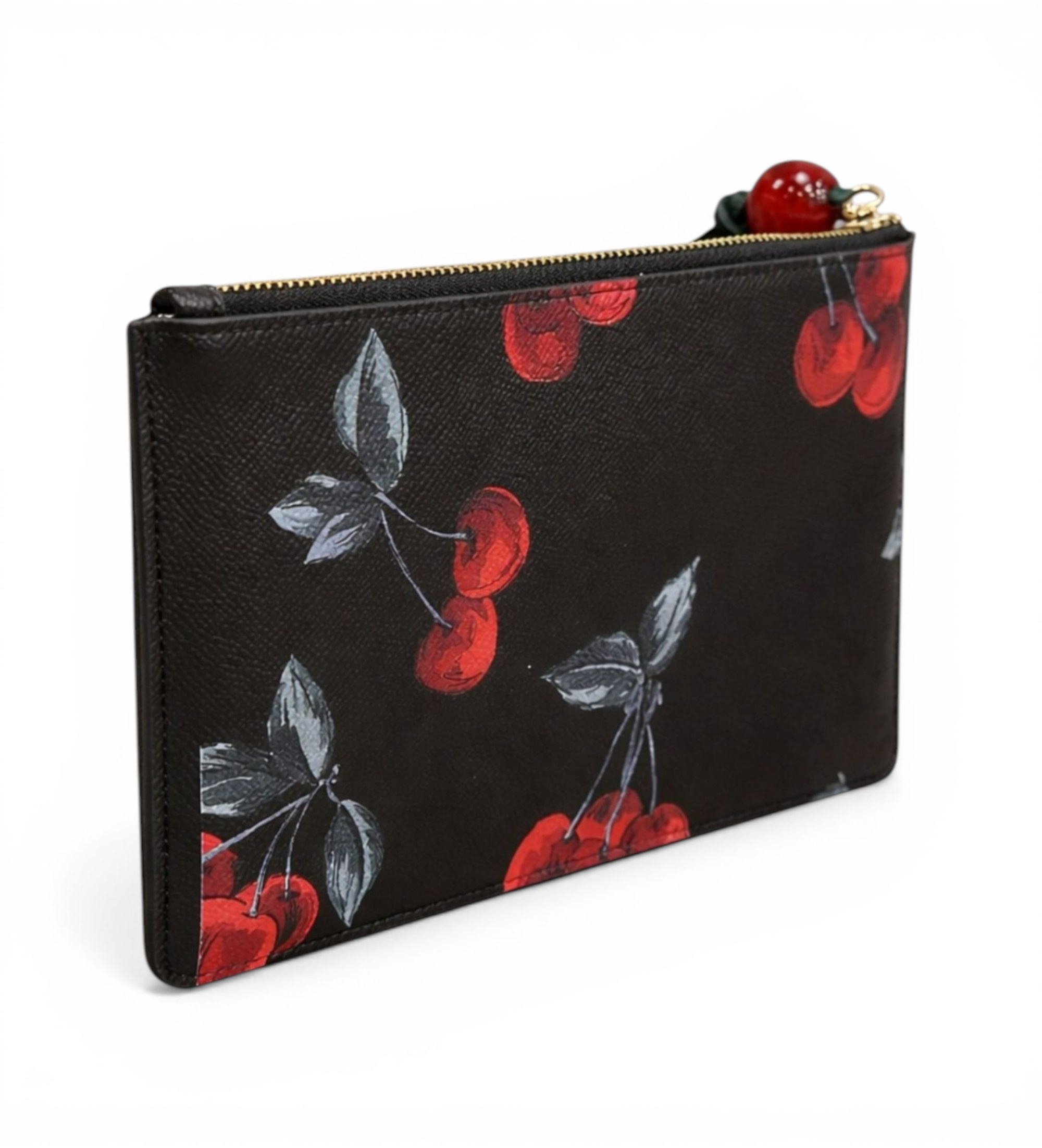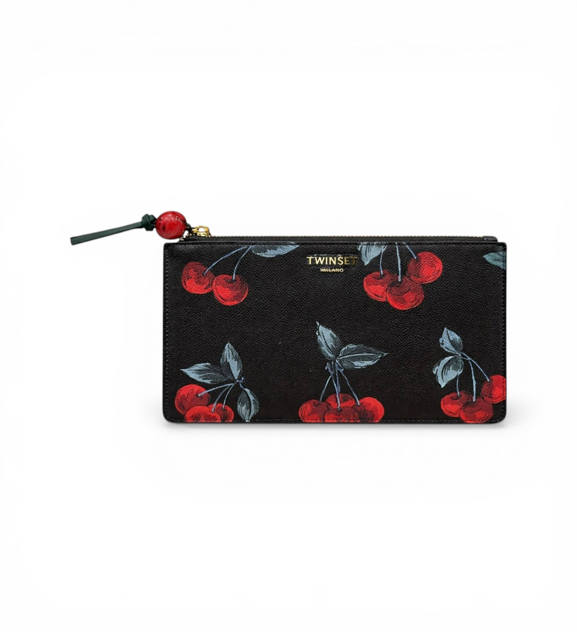 Flad pochette i sort tekstureret materiale med det umiskendelige røde kirsebærprint fra TWINSET Milanos mest romantiske kollektion. En accessory, der løfter ethvert look med et strejf af italiensk fantasi og raffinement, ideel til at bære alene eller som clutch i din yndlingstaske.