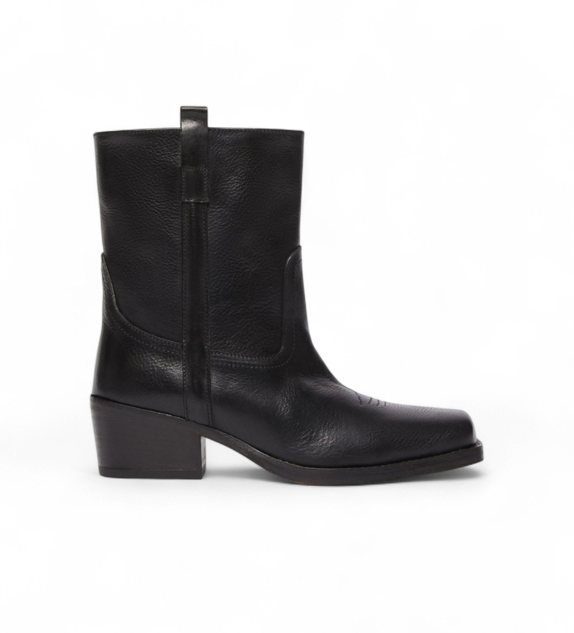 Cowboystøvler med et højt, lige ben og firkantet tå udsmykket med klassiske western-mønstre.