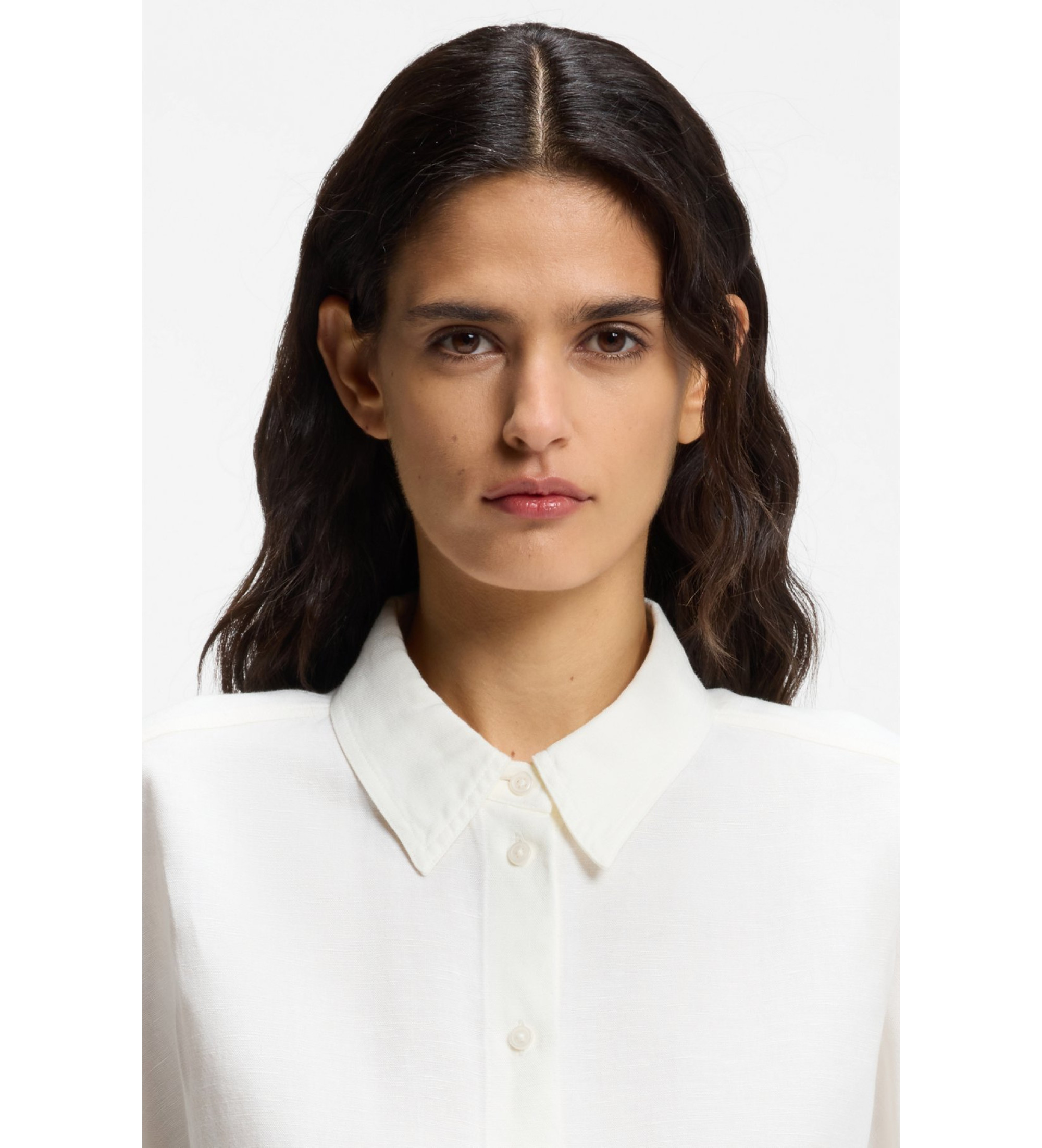 Diese BOSS Women's Bluse in normaler Passform mit gerollten Manschetten ist ein Klassiker. Gesticktes BOSS Logo auf dem Ärmel. Aus atmungsaktivem, sommerlichem Leinen.