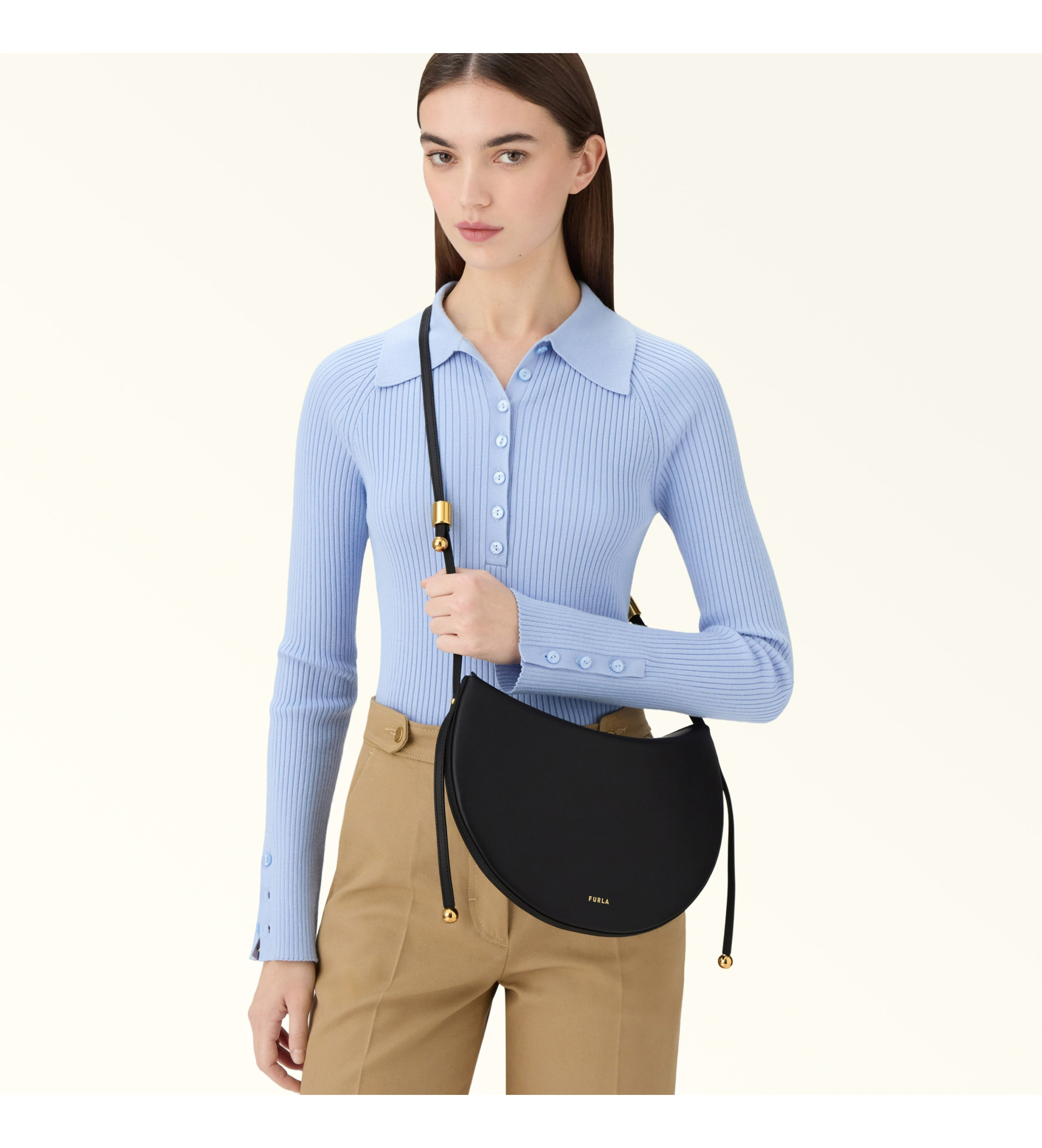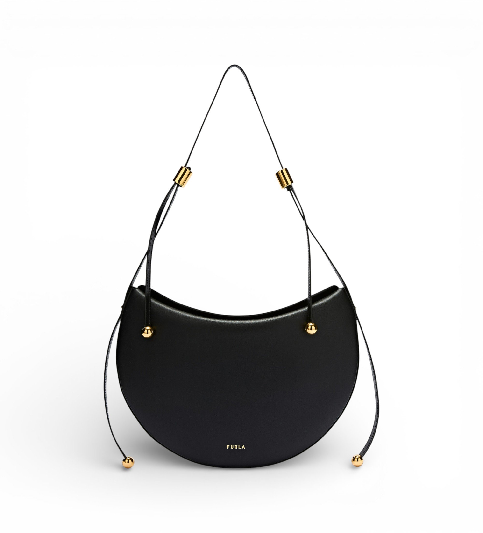 Die Furla Moonstone Umhängetasche zeigt eine moderne, vom Pferdesport inspirierte Silhouette mit einem Kalbslederdesign, das durch klare, abgerundete Linien hervorgehoben wird. Ein fester, längenverstellbarer Riemen bietet verschiedene Tragemöglichkeiten, während zylindrische Beschläge und zwei Sfera-Elemente einen Hauch von eleganter Originalität verleihen.