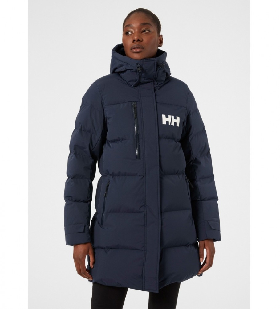 Ein gesteppter Parka für Damen in mittlerer Oberschenkellänge aus Langfasergewebe mit faltbaren, reflektierenden Paspeln, ideal für kalte Wintertage.