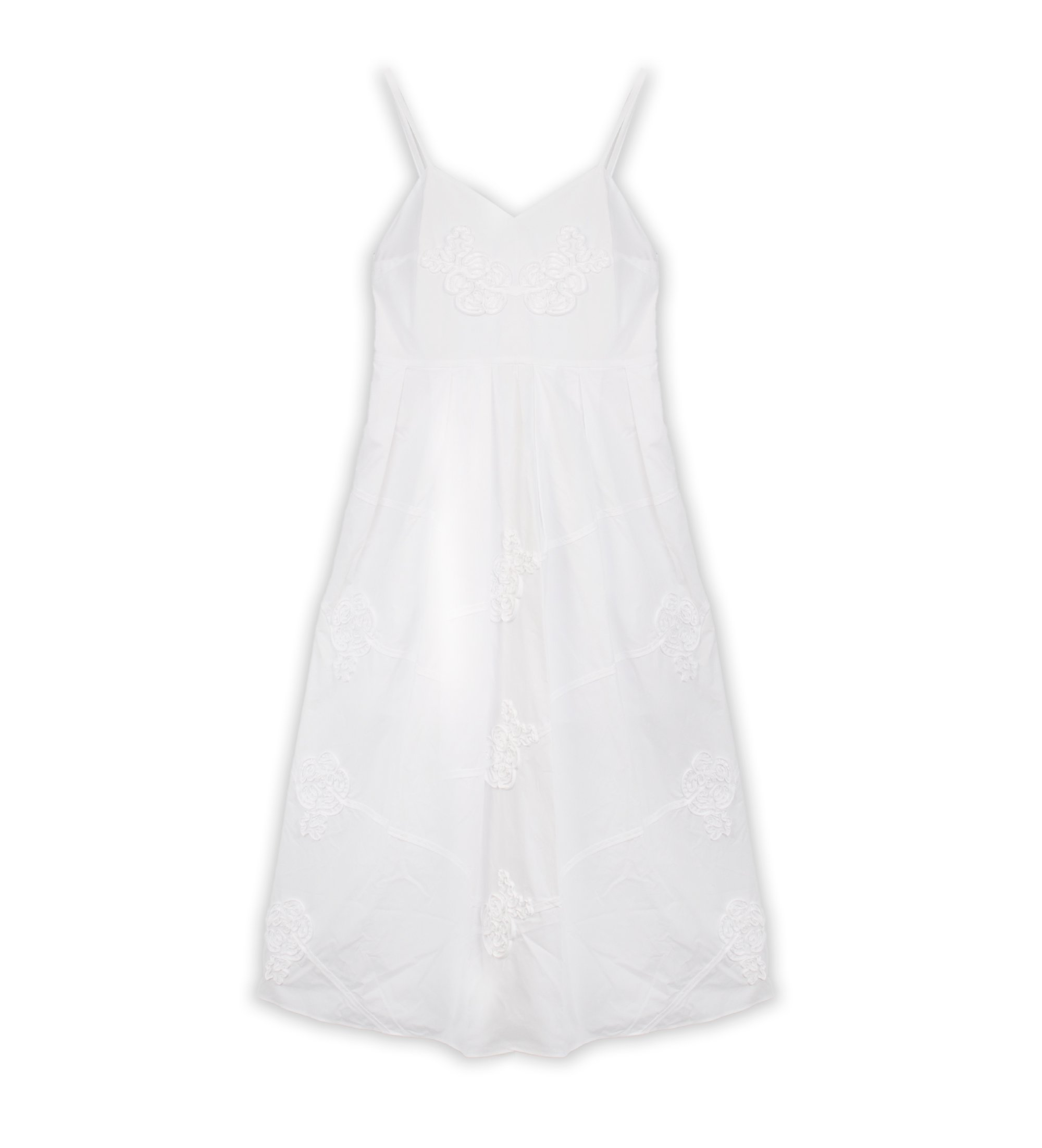 Weißes Midikleid mit schmalen Trägern und geprägter floraler Stickerei. Ein romantisches und leuchtendes Stück, das die Essenz des Sommers heraufbeschwört, perfekt für Tageslooks am Strand oder in der Stadt und leicht in einen Abendlook mit den richtigen Accessoires zu verwandeln.