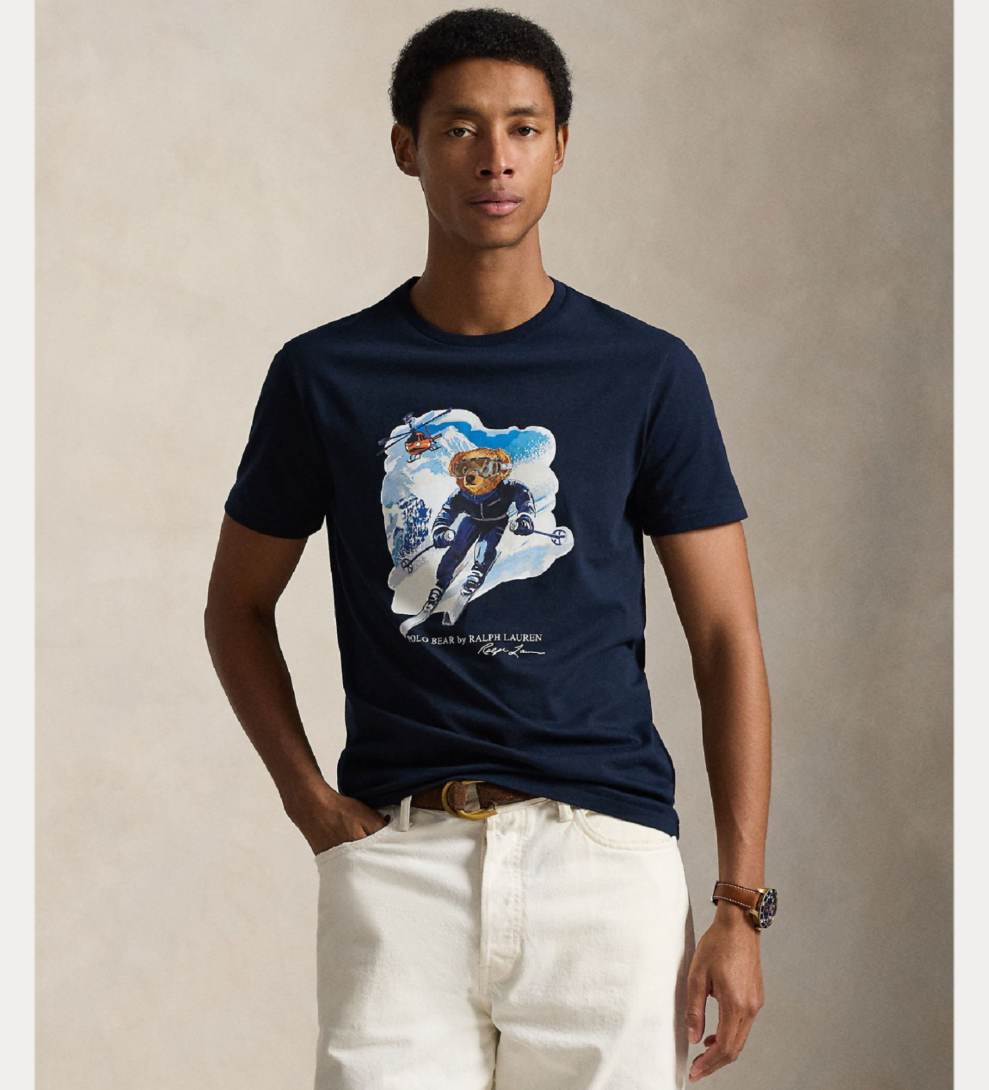 Dieses Jersey-Strick-T-Shirt zeigt eine verschneite Landschaft mit einem Hubschrauber und unserem geliebten Polo-Bären, der stilvoll Ski fährt, als wäre er der Protagonist eines klassischen Spionagefilms.
