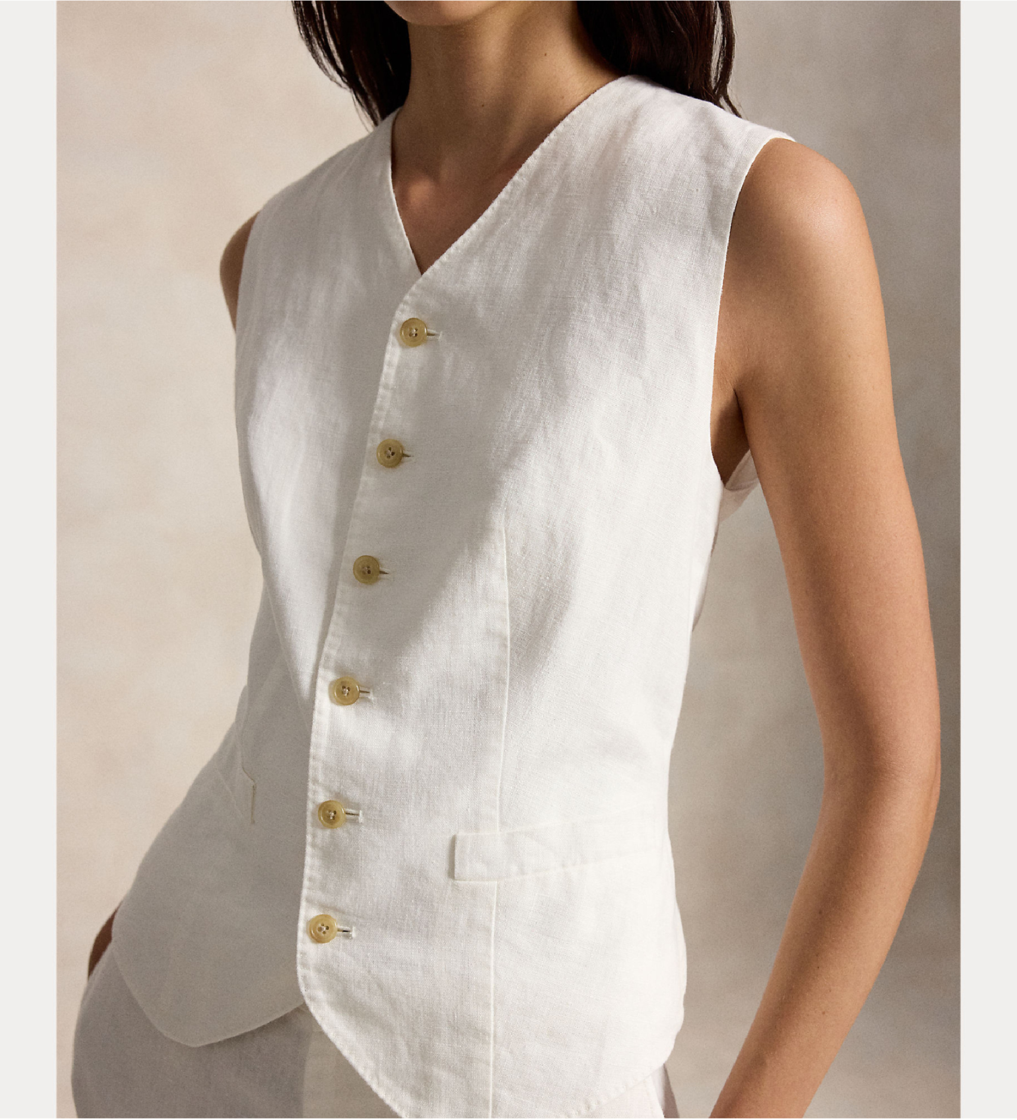 Diese geknöpfte Weste kombiniert einen gewebten Leinenstoff auf der Vorderseite mit einem leichten Baumwoll-Voile auf der Rückseite. Die klassisch taillierte Silhouette wird durch eine rückseitige Schnalle und einen gekerbten Saum ergänzt.