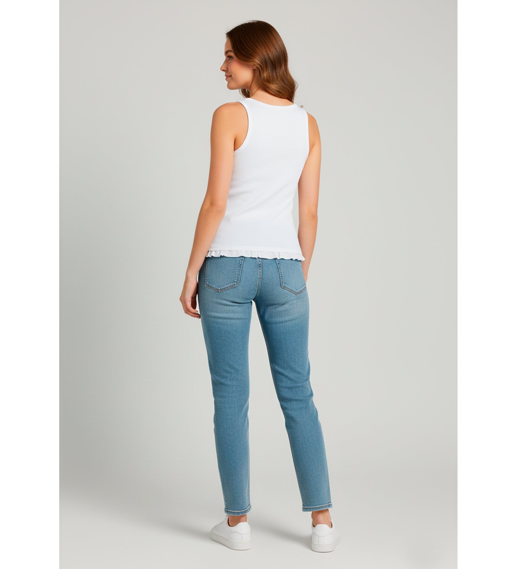Ein schmal geschnittenes T-Shirt in strahlendem Weiß, ein unverzichtbares Kleidungsstück mit einem klaren, femininen Design, das sich perfekt an die Silhouette anpasst. Ideal als Einzelstück oder als Basis für raffinierte Looks.