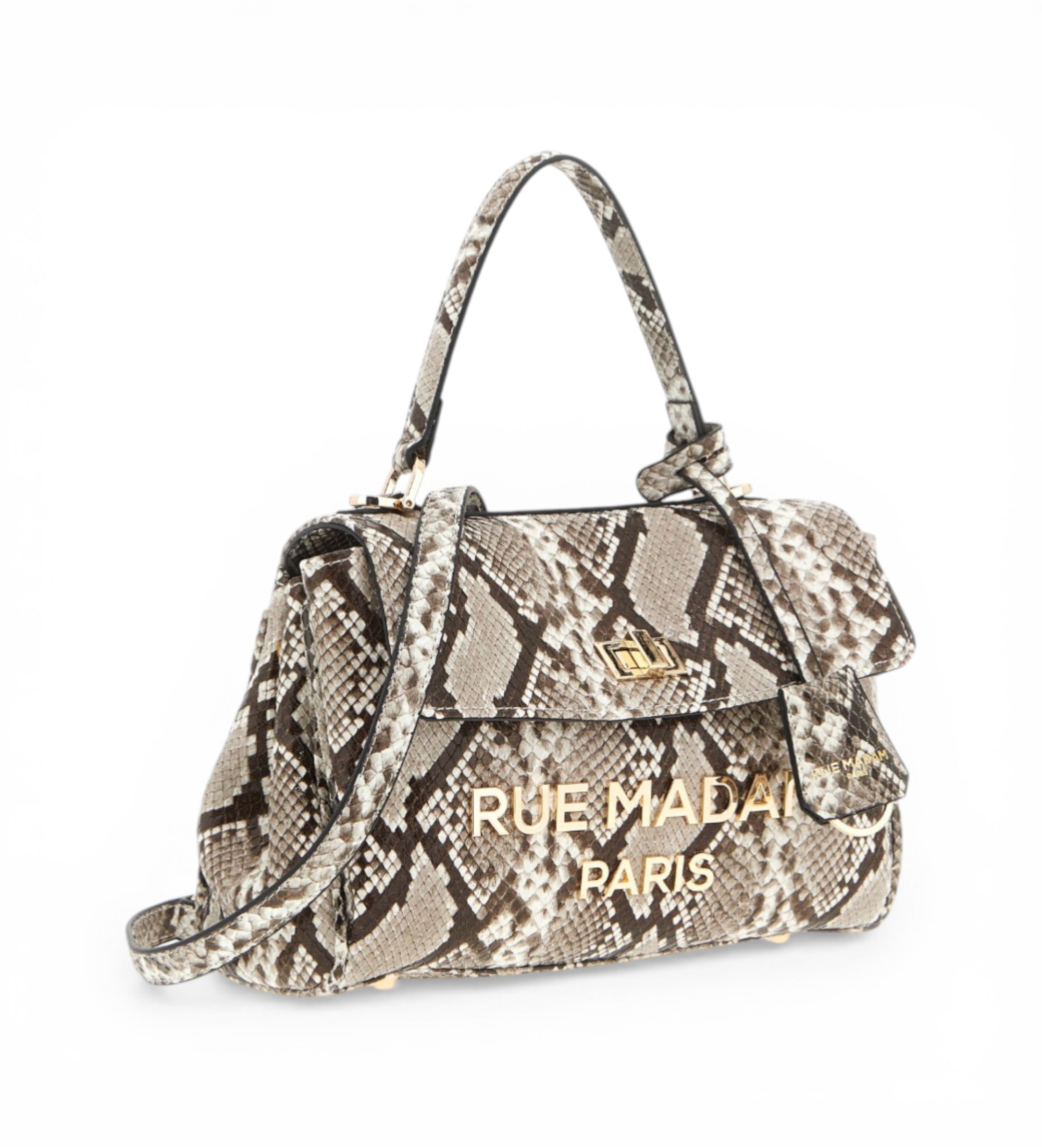 Kleine Umhängetasche aus weichem Kunstleder mit exotischem Python-Print, ein raffiniertes und zeitloses Design. Ein goldfarbenes Metalllogo und ein Drehverschluss unterstreichen den raffinierten Stil. Ausgestattet mit einem Henkel und einem abnehmbaren Schulterriemen für Vielseitigkeit, verfügt sie über ein zentrales Fach und ein Baumwollfutter mit Innentasche für die praktische Organisation von persönlichen Gegenständen. Maße: 26 cm breit × 19 cm hoch × 10 cm tief.