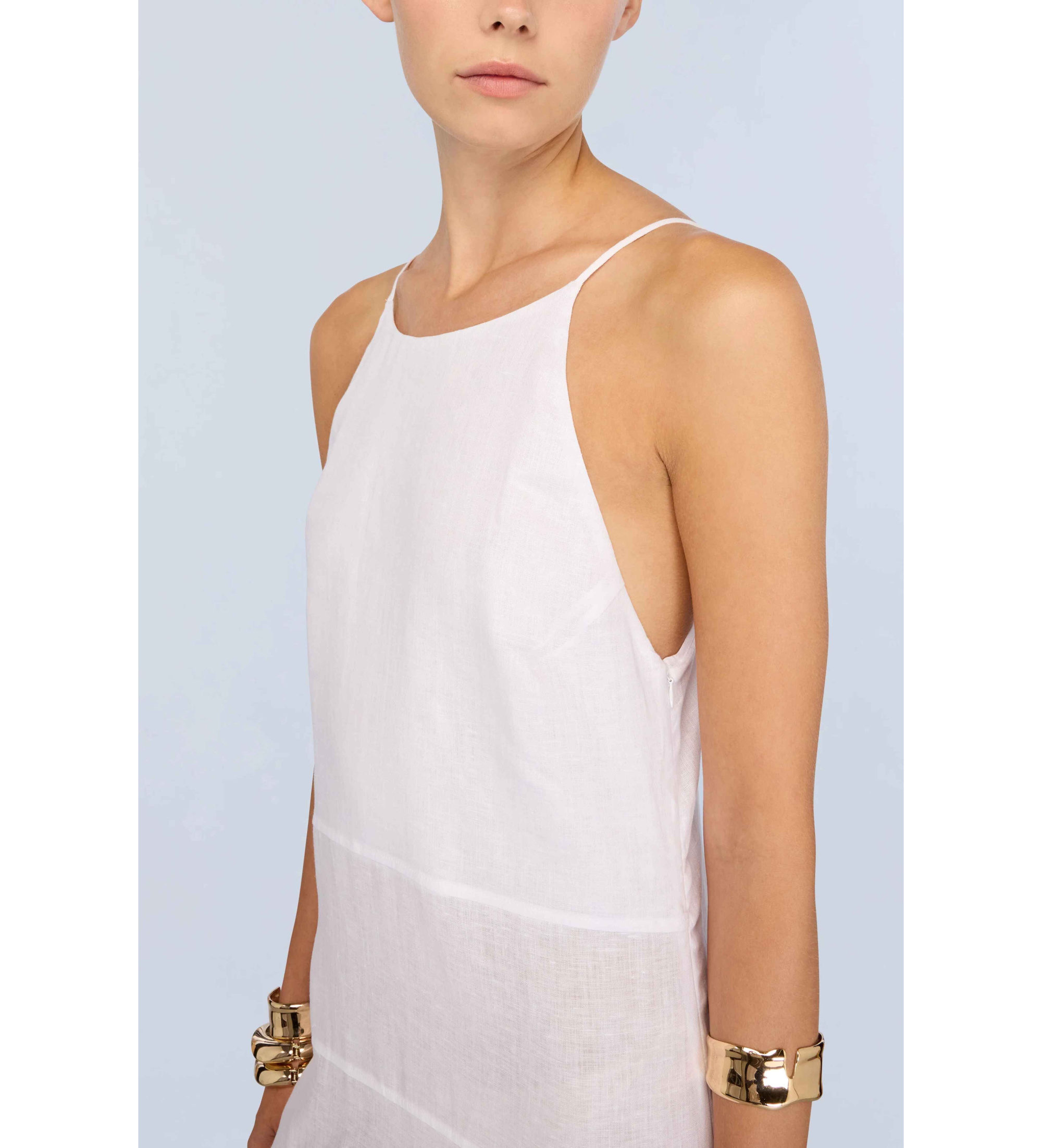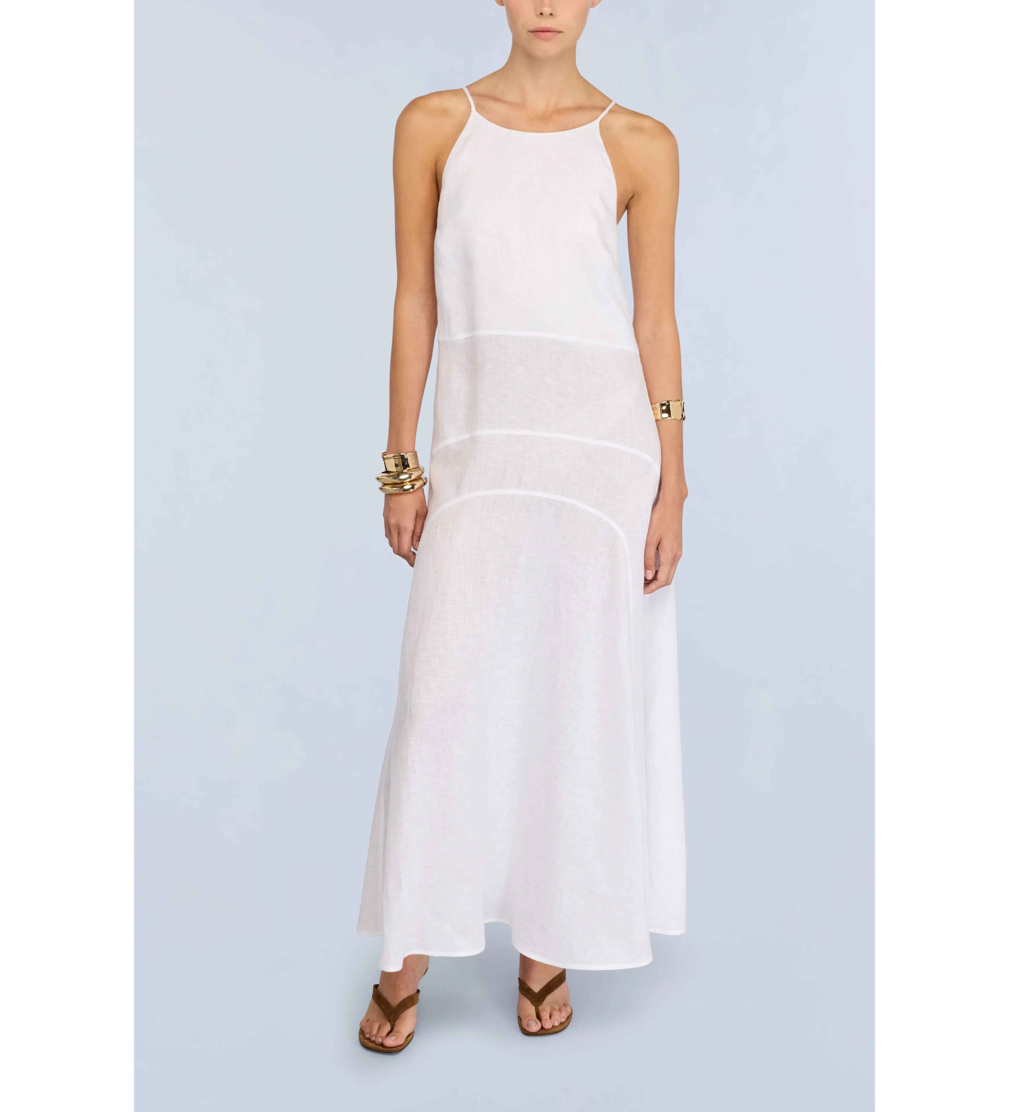 Reinheit in ihrer reinsten Form. Das Abito Felicia ist ein langes weißes Leinenkleid, das die Essenz des mediterranen Sommers einfängt: klar, leuchtend und raffiniert. Die gestuften, geschwungenen Einsätze am Rock bringen Bewegung und eine subtile Geometrie in eine natürlich fließende Silhouette. Ein zeitloses Kleidungsstück, das sowohl tagsüber als auch abends glänzt.