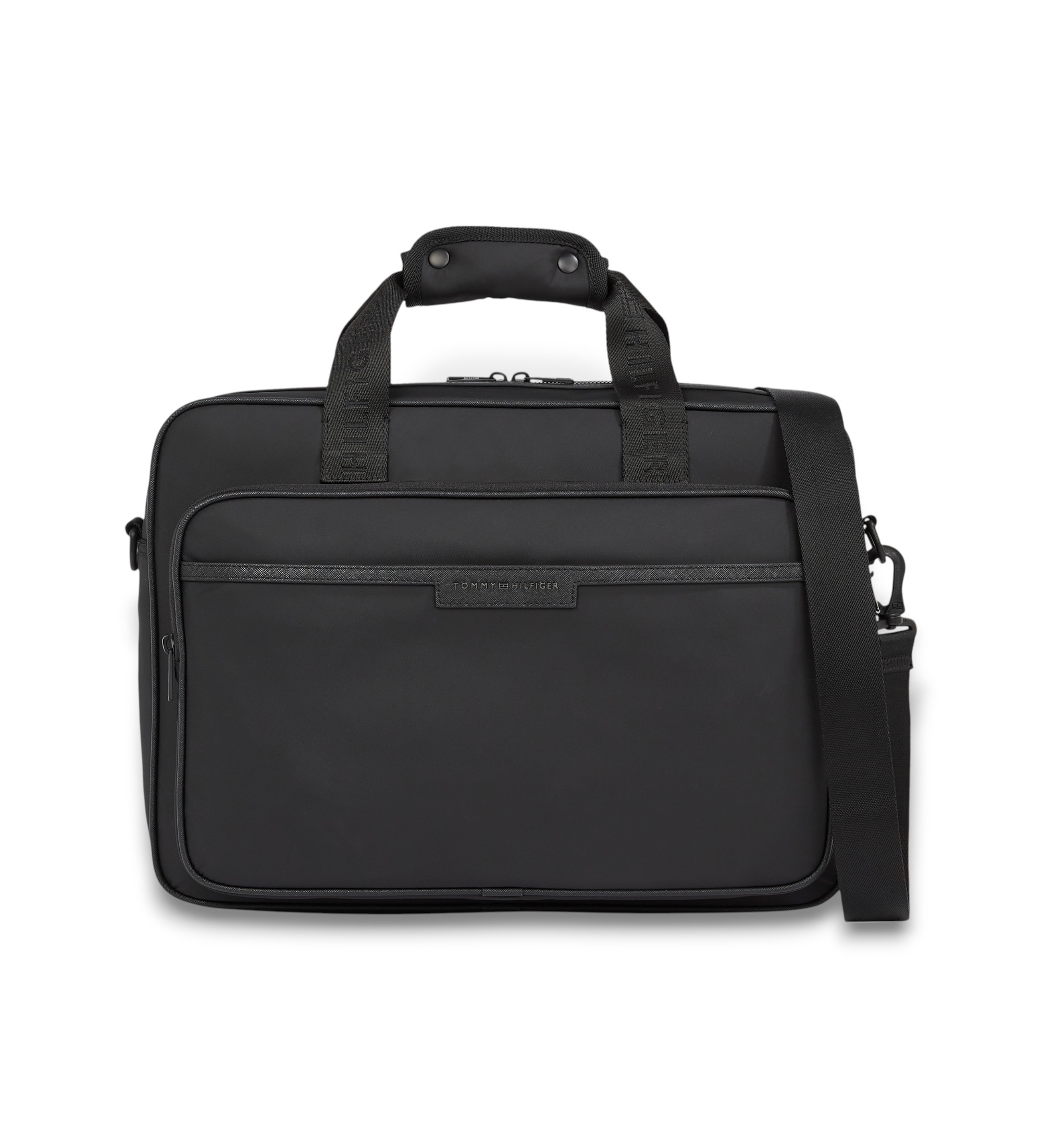 Diese elegante Dokumententasche mit einem tonalen Metallic-Logo auf der Vorderseite verfügt über ein integriertes Laptop-Fach, mehrere praktische Fächer, zwei Tragegriffe und einen Schulterriemen.
