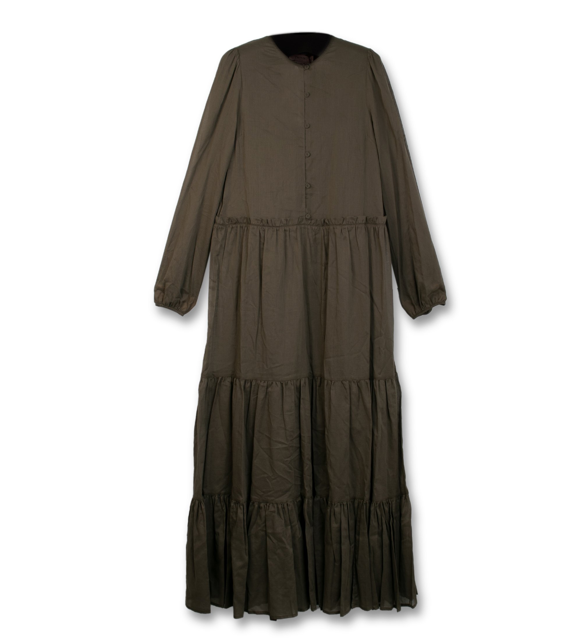 Olivgrünes Maxikleid im böhmischen Stil mit freiem Geist. Der leichte Stoff und der großzügige, gestufte Rock erzeugen eine umhüllende Bewegung, die bei jedem Schritt fließt, während die langen Ärmel und das locker sitzende Oberteil kompromisslosen Komfort bieten. Ein Stück mit Seele und Charakter, perfekt für alle, die Mode mit Authentizität schätzen.