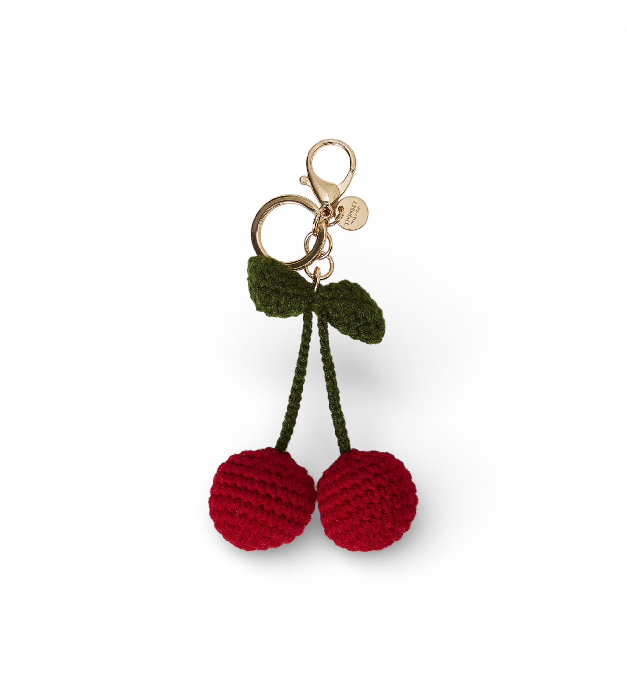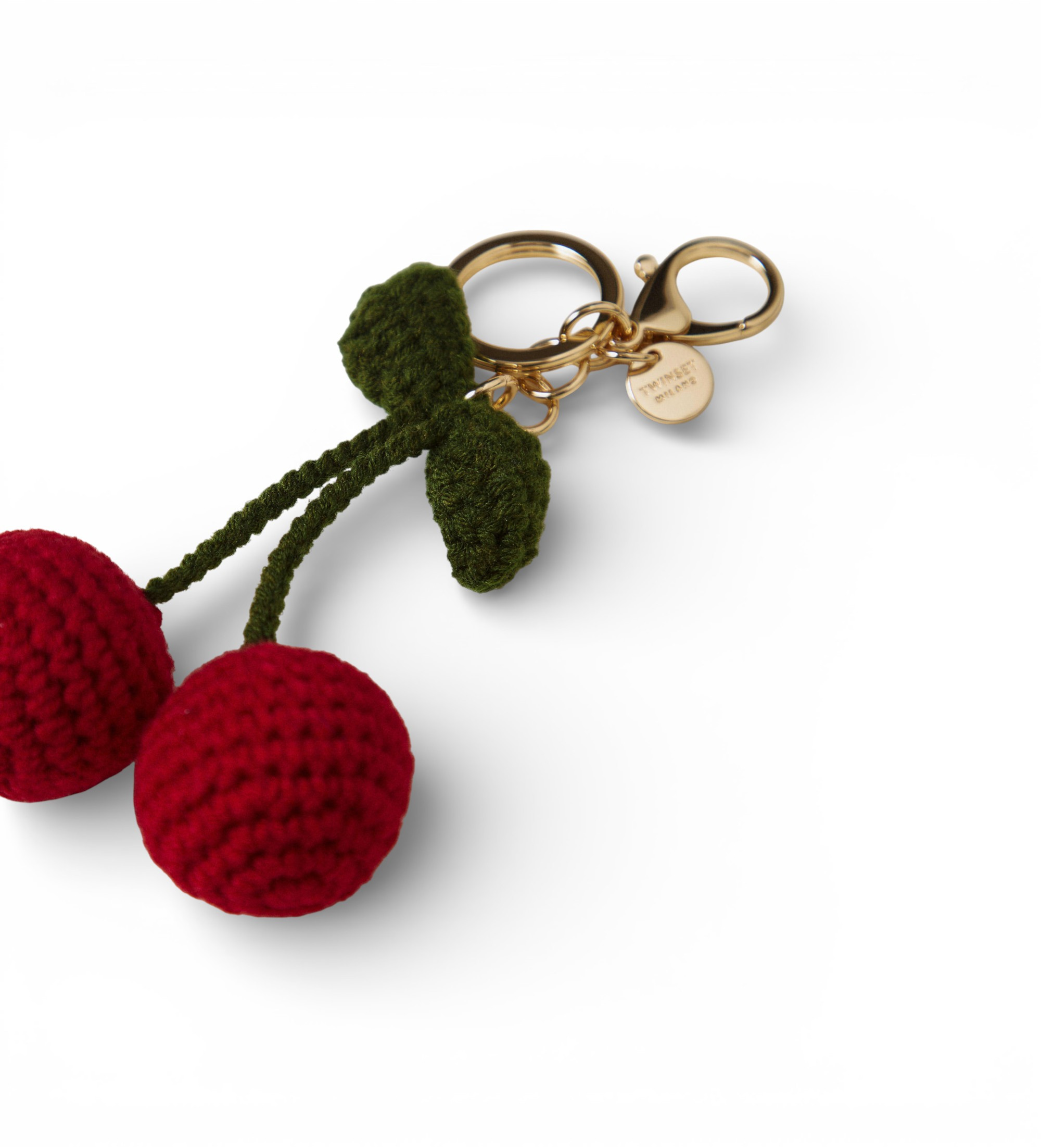 Schlüsselanhänger aus handgehäkelter Baumwolle mit Kirschen. Mit Karabiner und Ring, runder Logoplakette und goldfarbenem, galvanisiertem Metall. Kann auch als Anhänger verwendet werden, um Ihre Taschen zu personalisieren.