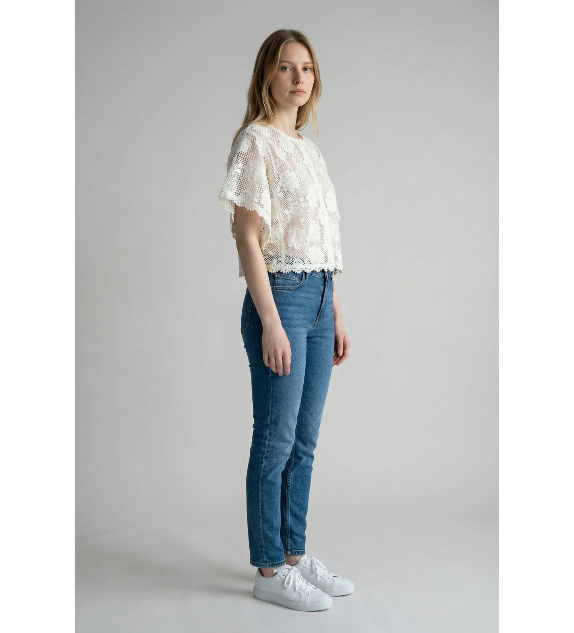 Kurze Jacke mit floraler Spitze in Off-White, entworfen von TWINSET. Die weite Silhouette und die Schmetterlingsärmel verleihen ihr eine ätherische Femininität, die jeden Look der Saison perfekt aufwertet. Ein romantisches Must-Have, das Handwerkskunst und Raffinesse in jedem Detail vereint.