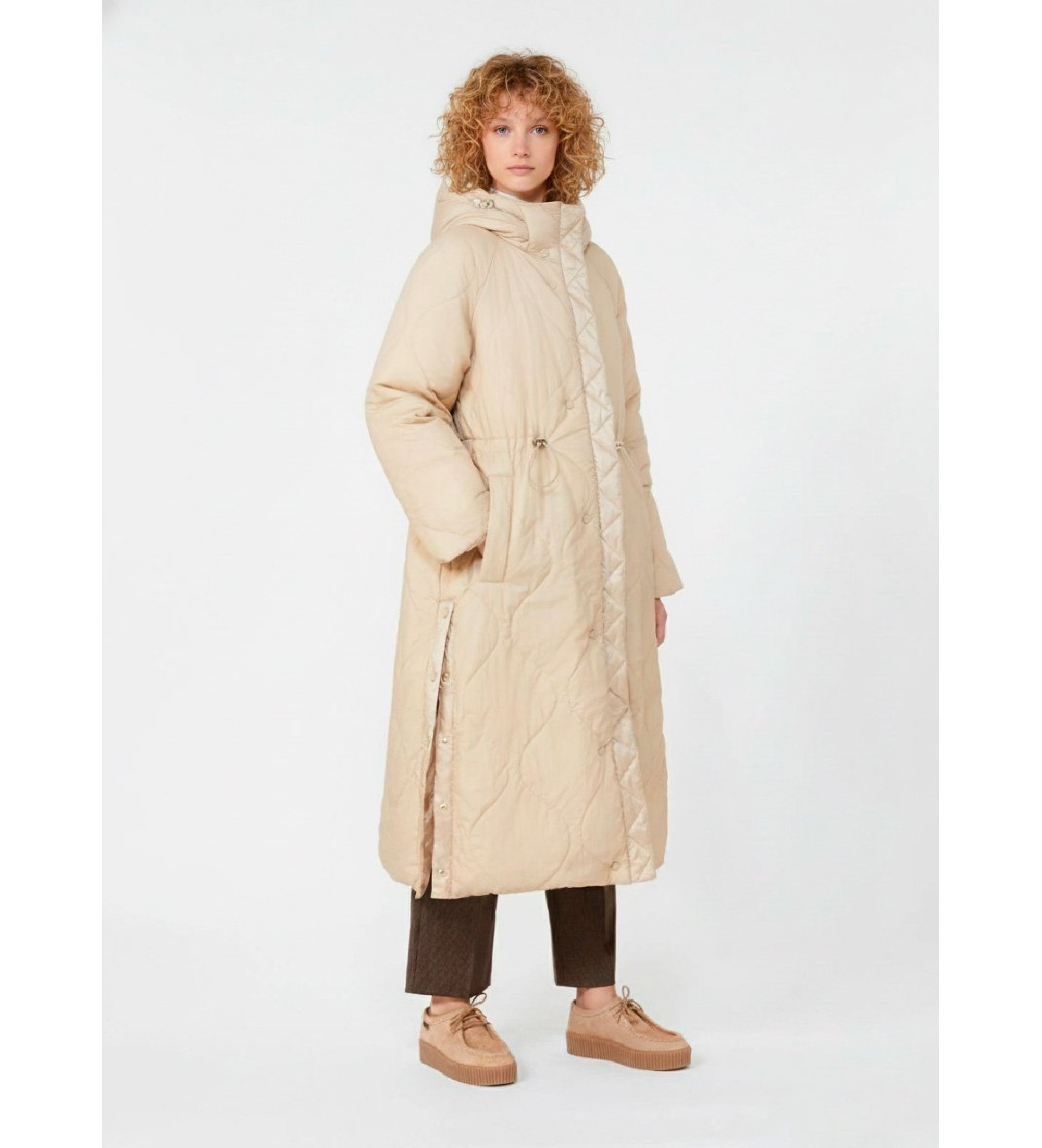 Lange Wendejacke mit Kapuze mit Kordelzug, Raglanärmeln und verstellbarem Kordelzug in der Taille.