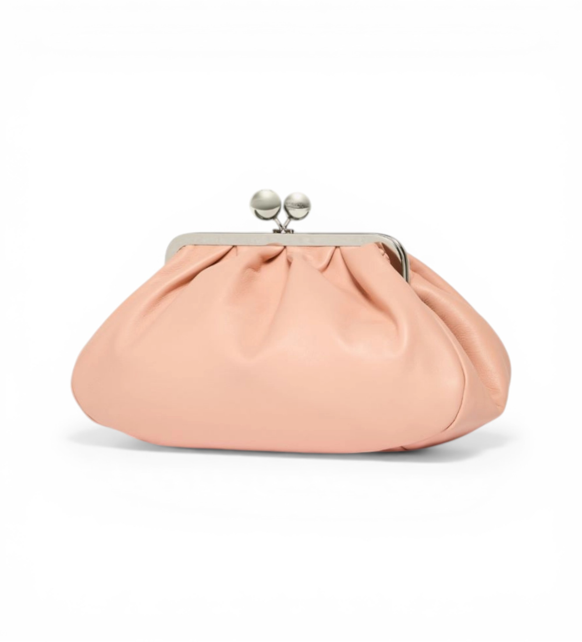 Dekonstruierte mittelgroße Pasticcino-Tasche. Der lange Kettenriemen mit gestepptem Lederdetail und der kurze Lederriemen ermöglichen es, die Tasche in der Hand oder quer über den Körper zu tragen, wobei beide mit einziehbaren Haken entfernt werden können.