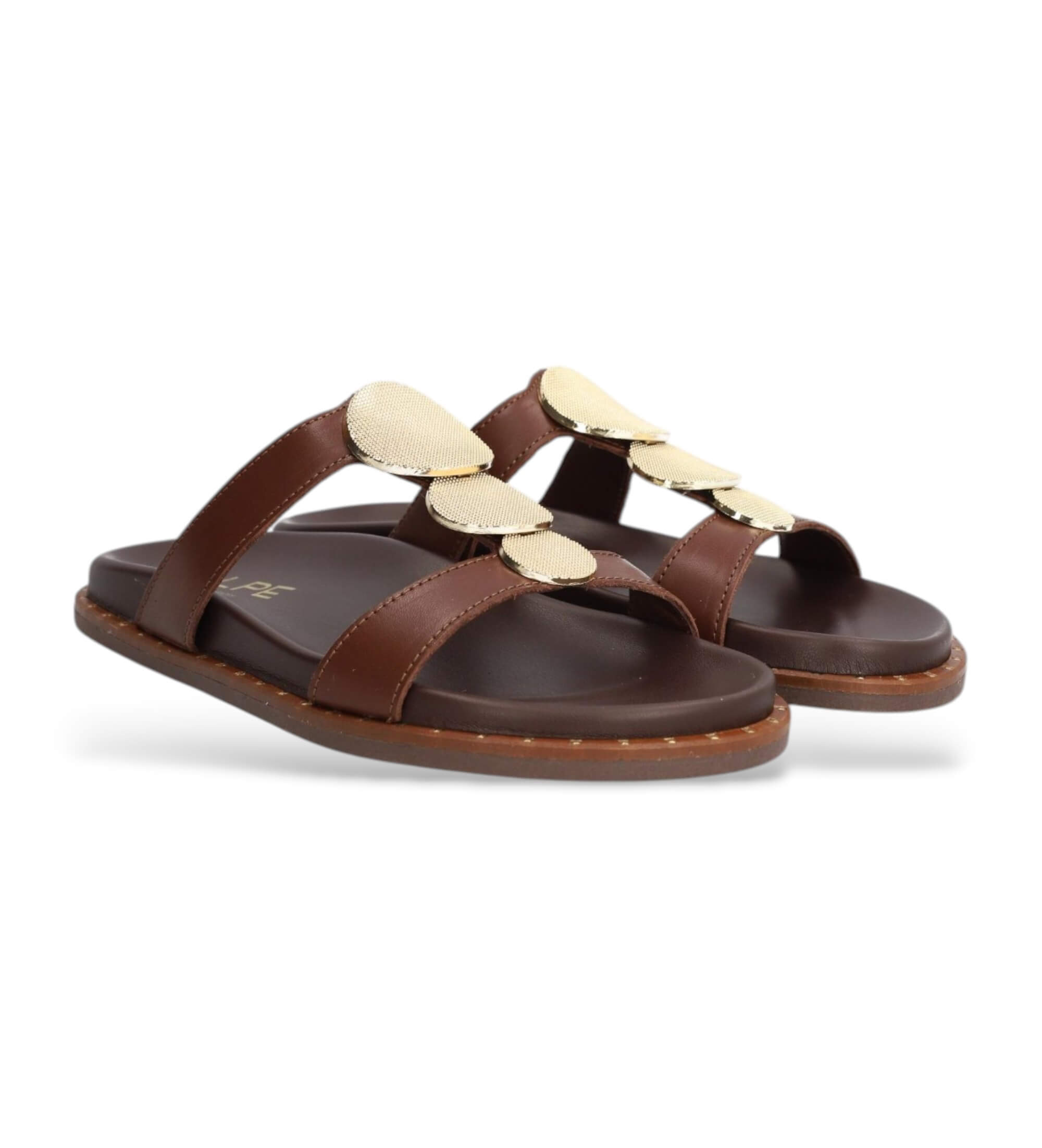 Flat brown leather sandal with an open T-shaped design, featuring three striking large gold medallions that run along the instep. A minimalist, clean-lined design that elevates the shoe to accessory status, perfect for pairing with summer looks, flowing dresses or linen trousers.