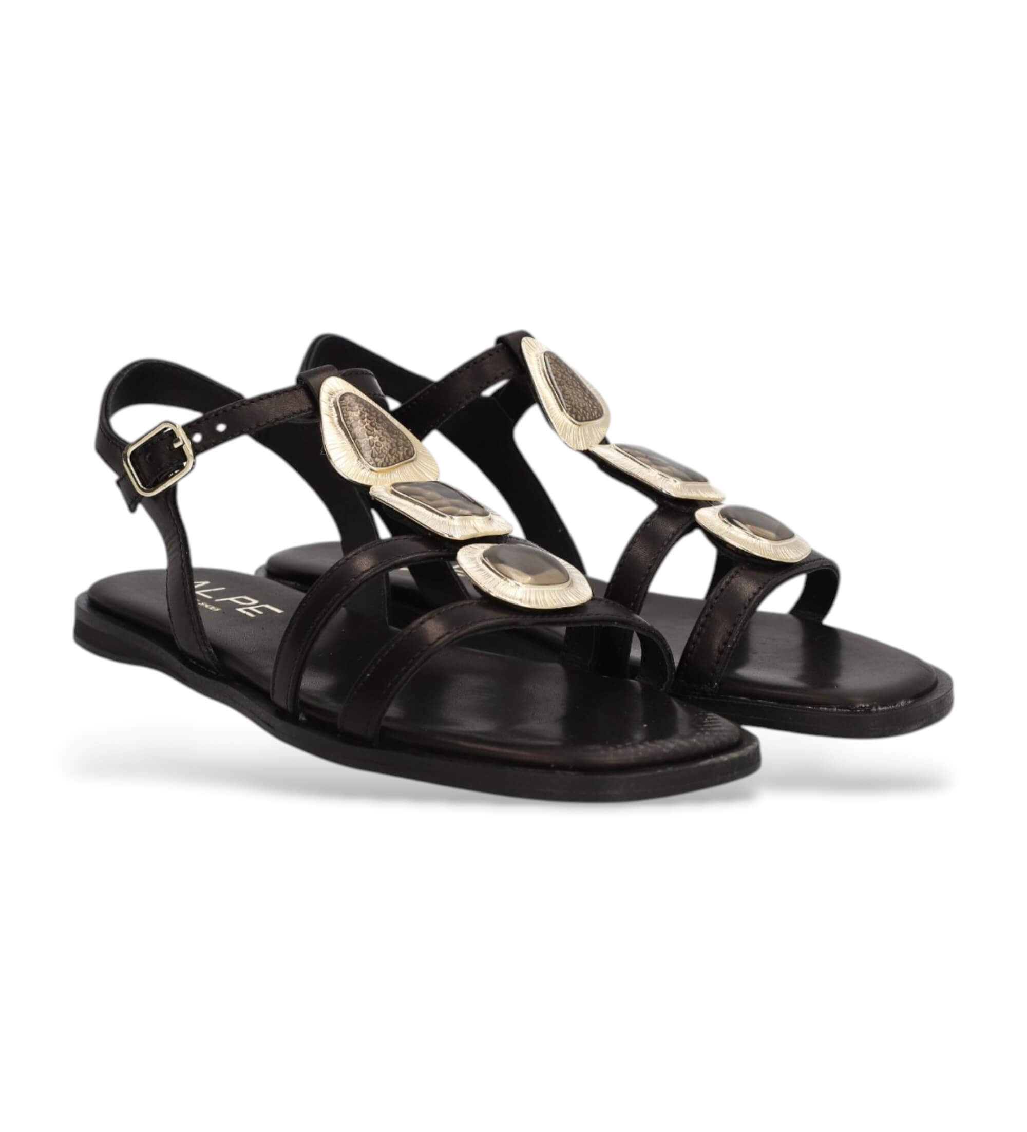 A flat sandal in tan leather with a T-strap design and sleek, clean lines. The oversized square buckle in matt gold on the ankle turns this seasonal classic into a piece with character, perfect for both day and night outfits. Versatile and sophisticated, it pairs perfectly with midi skirts, flowing trousers or summer dresses.