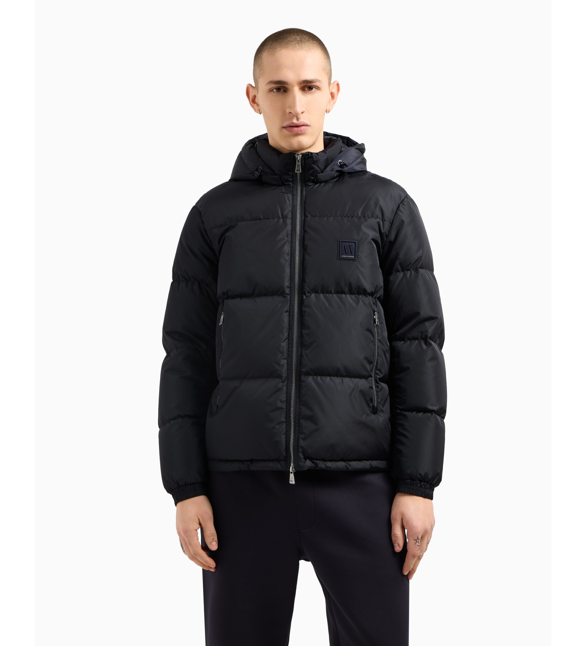 Real down jacket in shiny nylon, with detachable adjustable hood with coulisse. Zip fastening and metal pockets with embellished logo patch. Ideal for those looking for a warm and functional garment with a modern and elegant design. Perfect for winter.
