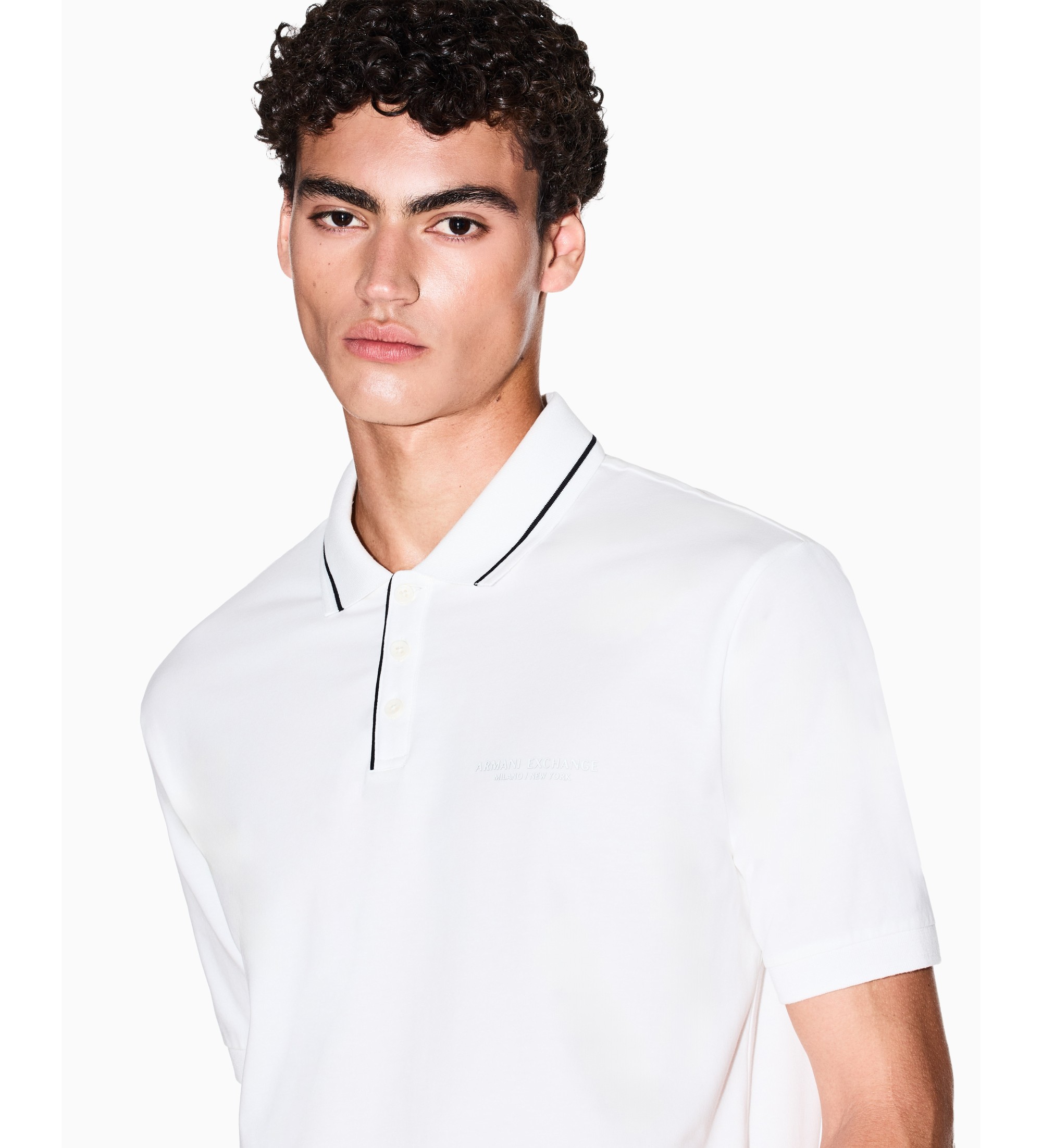 Regular fit polo shirt in comfortable stretch cotton jersey, combining the softness of jersey with the flexibility of stretch fabric for superior comfort. This polo shirt stands out for its refined details: the contrasting piping on the collar and along the button placket gives it a sharp, graphic touch, while the "Armani Exchange Milano / New York" lettering printed tone-on-tone on the chest lends it understated elegance.