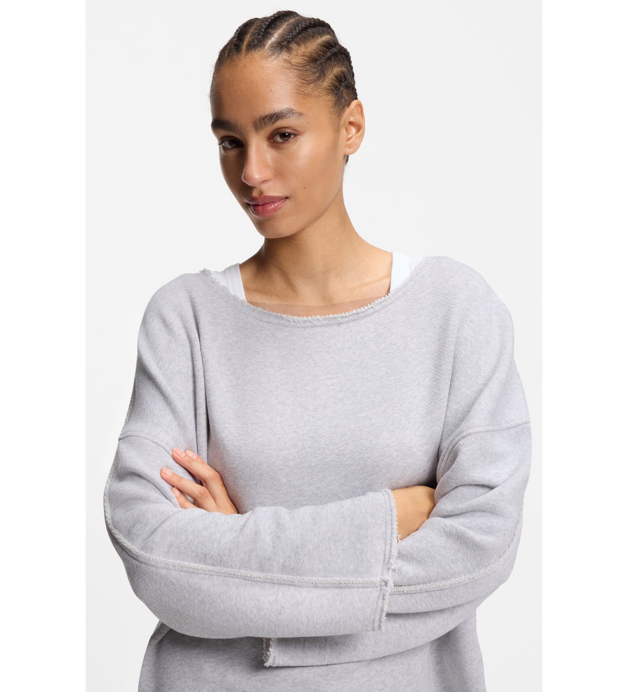 This BOSS Women's loose-fit sweatshirt in soft stretch cotton is a leisurewear essential. Raw edges. Embroidered calligraphed logo.