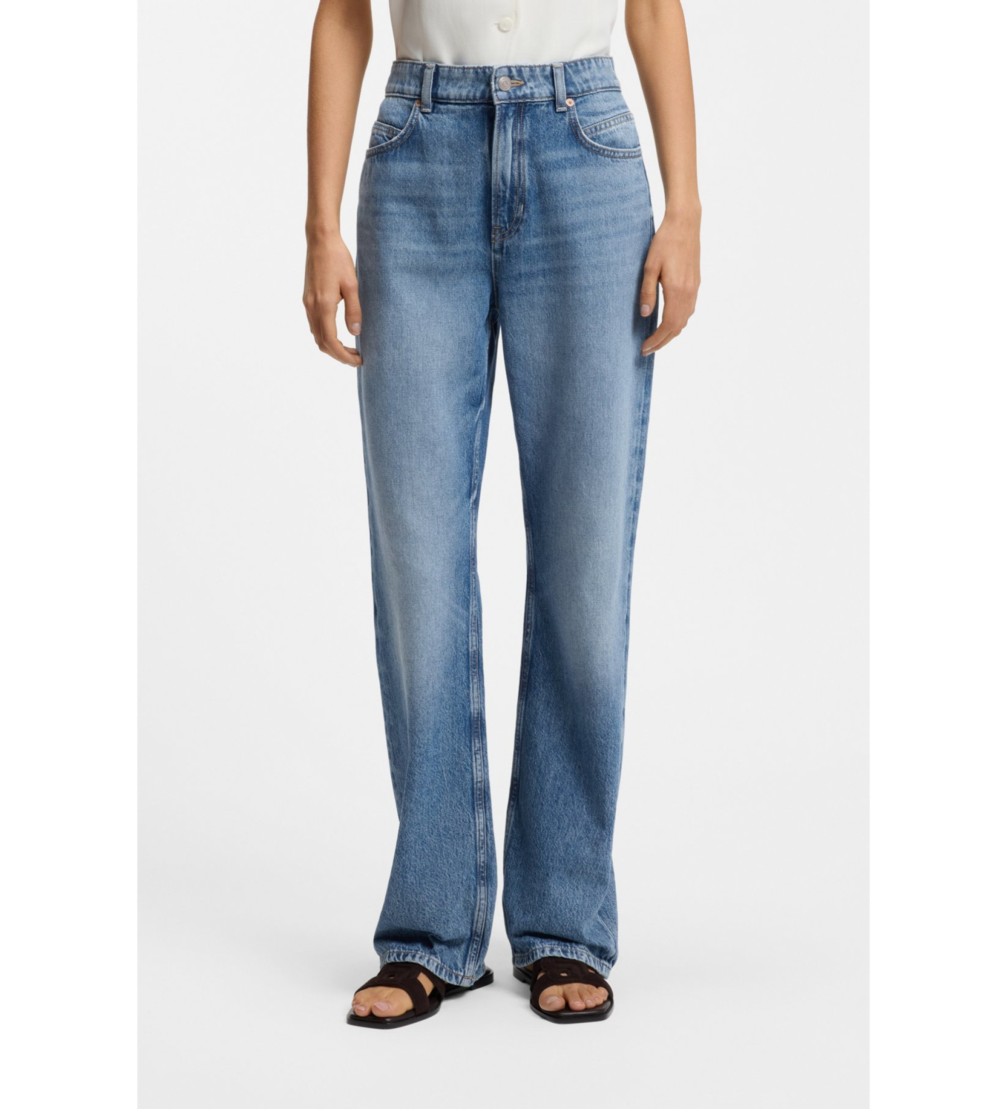 These high-waisted BOSS Women's straight-fit jeans have a flattering V-stitch at the back and an original blue tone. Soft, structured denim.
