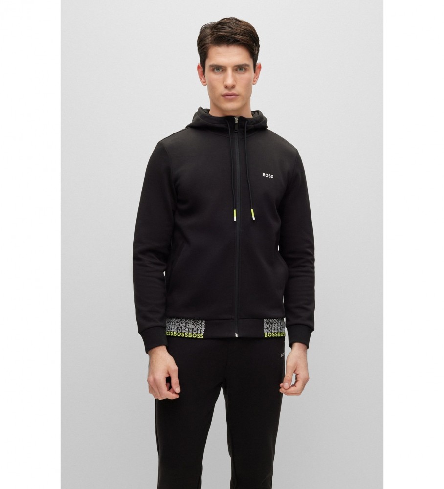 Regular-fit BOSS Menswear zip-up hooded sweatshirt in stretch fabric, finished with an embroidered multicoloured brand detail on the hem.
