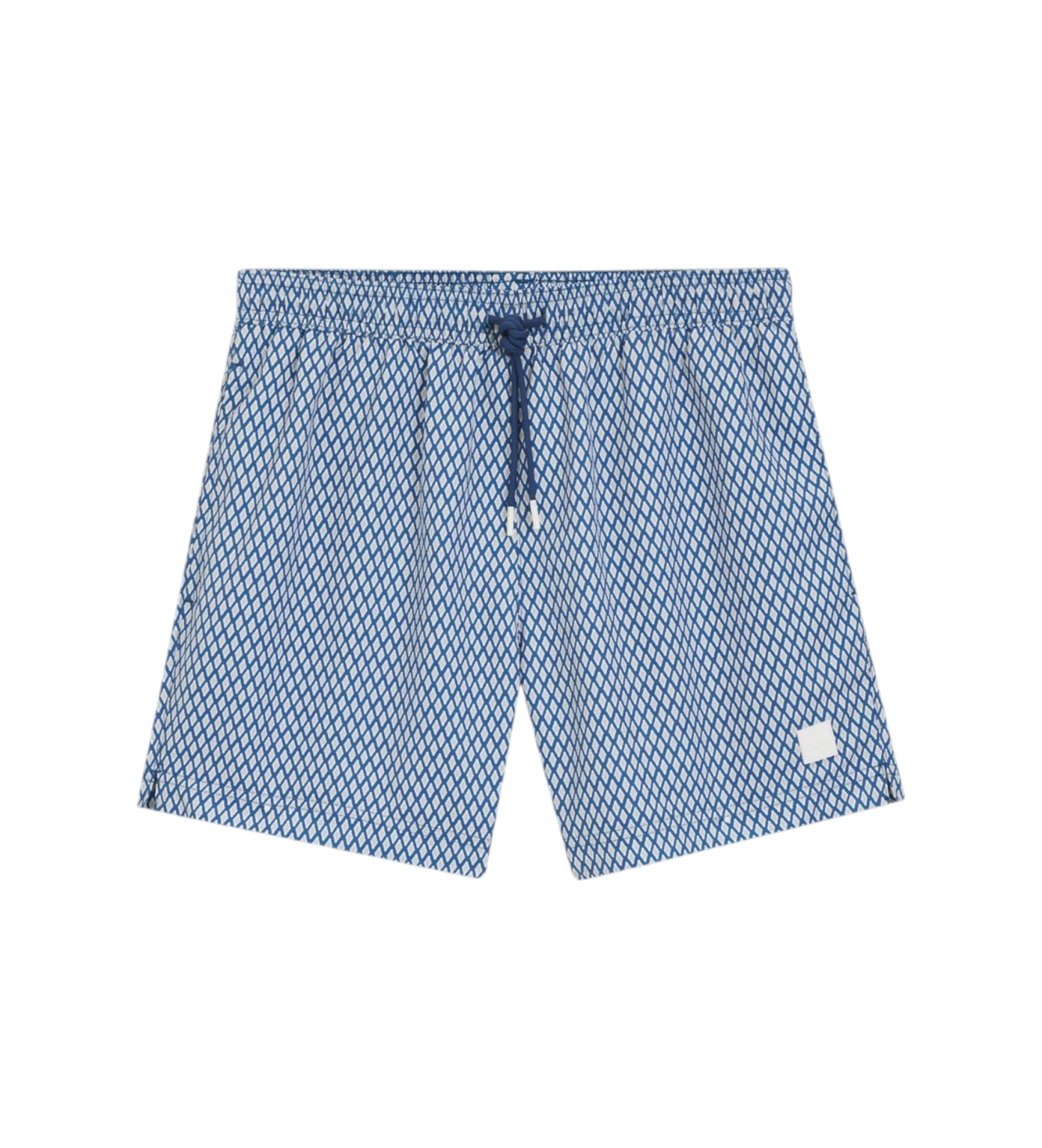 Short-cut swimsuit designed for men looking for a clean, contemporary look for the beach and pool. Featuring a geometric print in blue tones on a light background, elasticated waist with adjustable drawstring and side pockets for functionality. Mesh lining and lightweight, quick-drying fabric for comfort after swimming. A discreet logo detail at the hem adds a touch of sophistication without fuss.