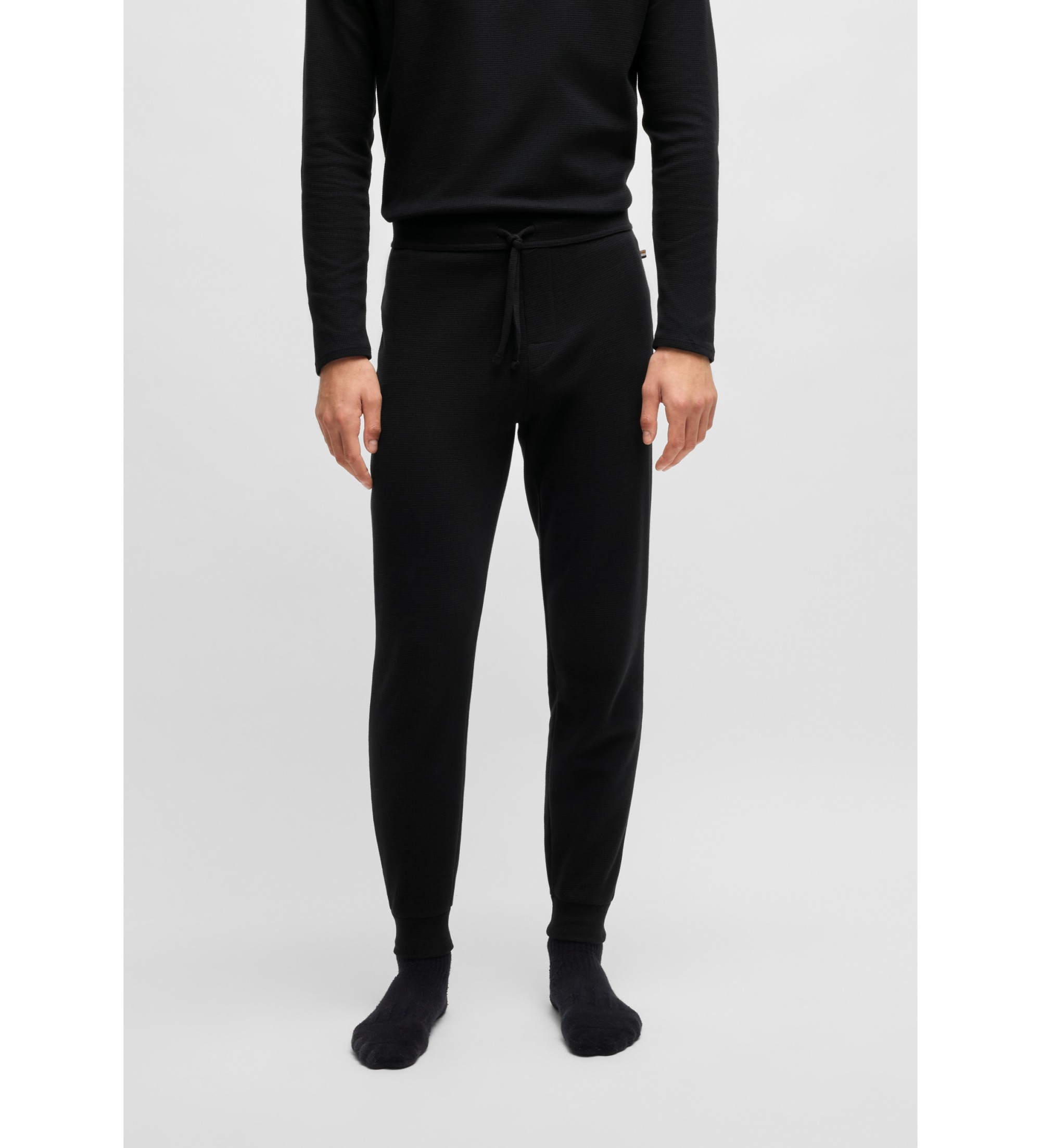 BOSS Menswear pyjama trousers with a mesh construction in a soft blend. These cuffed trousers feature a drawstring waistband and embroidered brand detail.