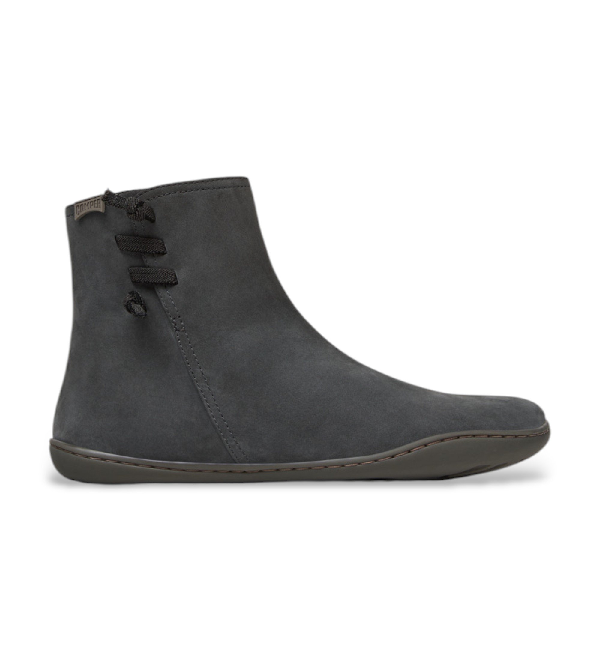 Camper women's Peu ankle boots in grey, made from cowhide and nubuck leather with a minimalist and timeless design. Inspired by the sensation of walking barefoot, they offer a natural fit and exceptional comfort thanks to their 360° stitched construction and Strobel technique, which provides flexibility and resistance with every step.