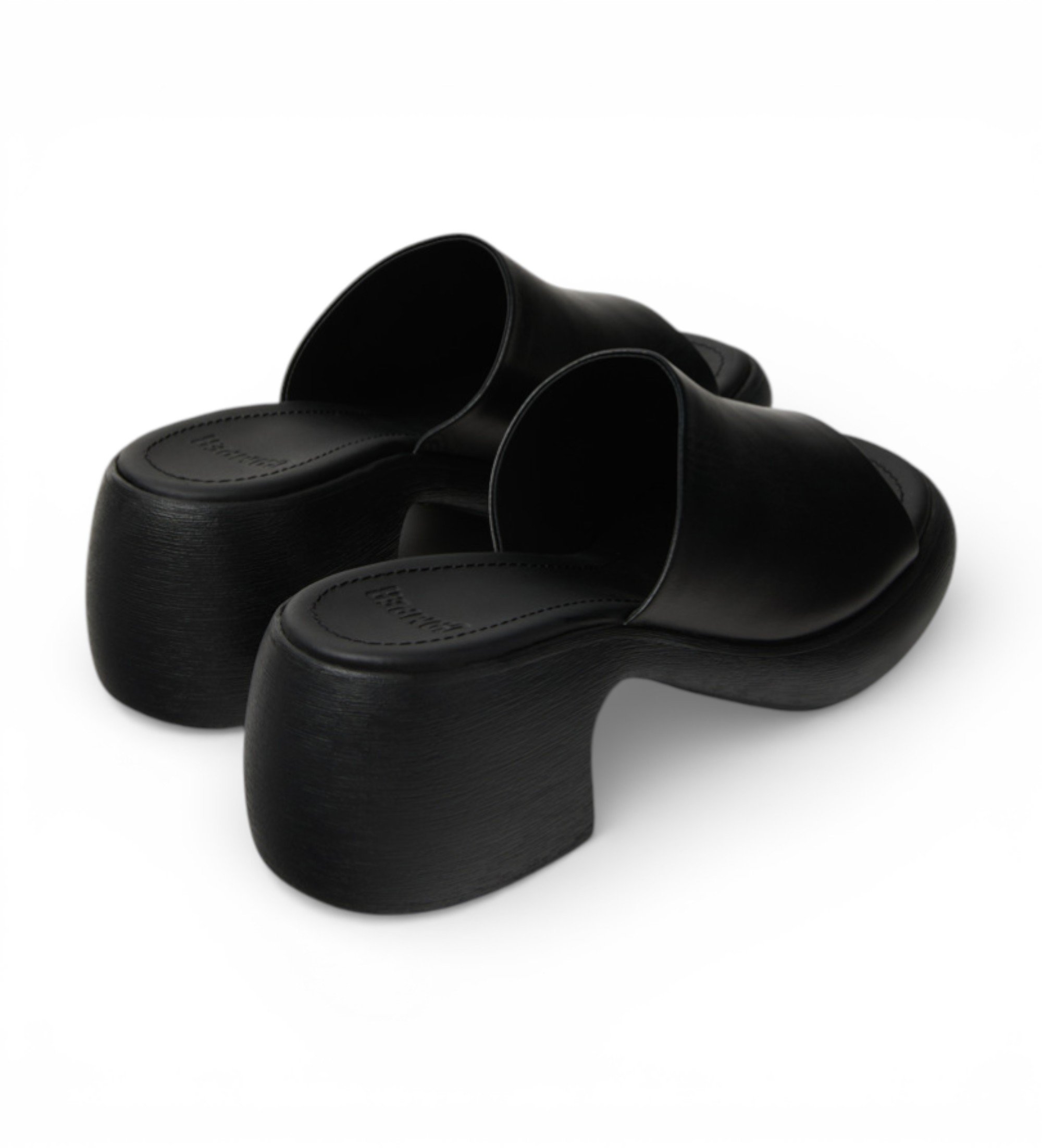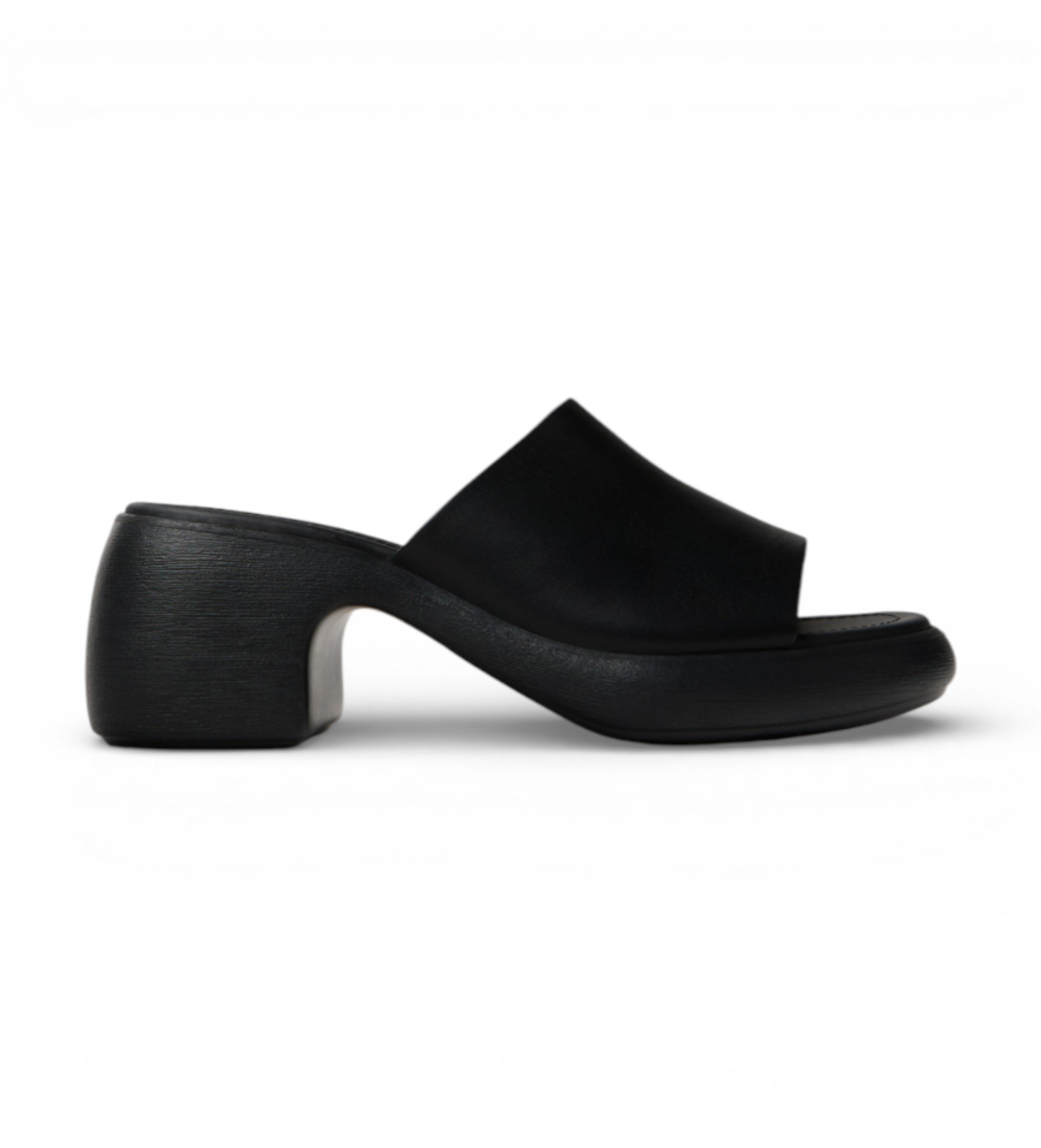 Women's black cowhide leather sandals with OrthoLite® Recycled™ footbed and XL EXTRALIGHT® EVA soles. Thelma features an elegant combination of volume and a curvaceous heel with a distinctly feminine character.