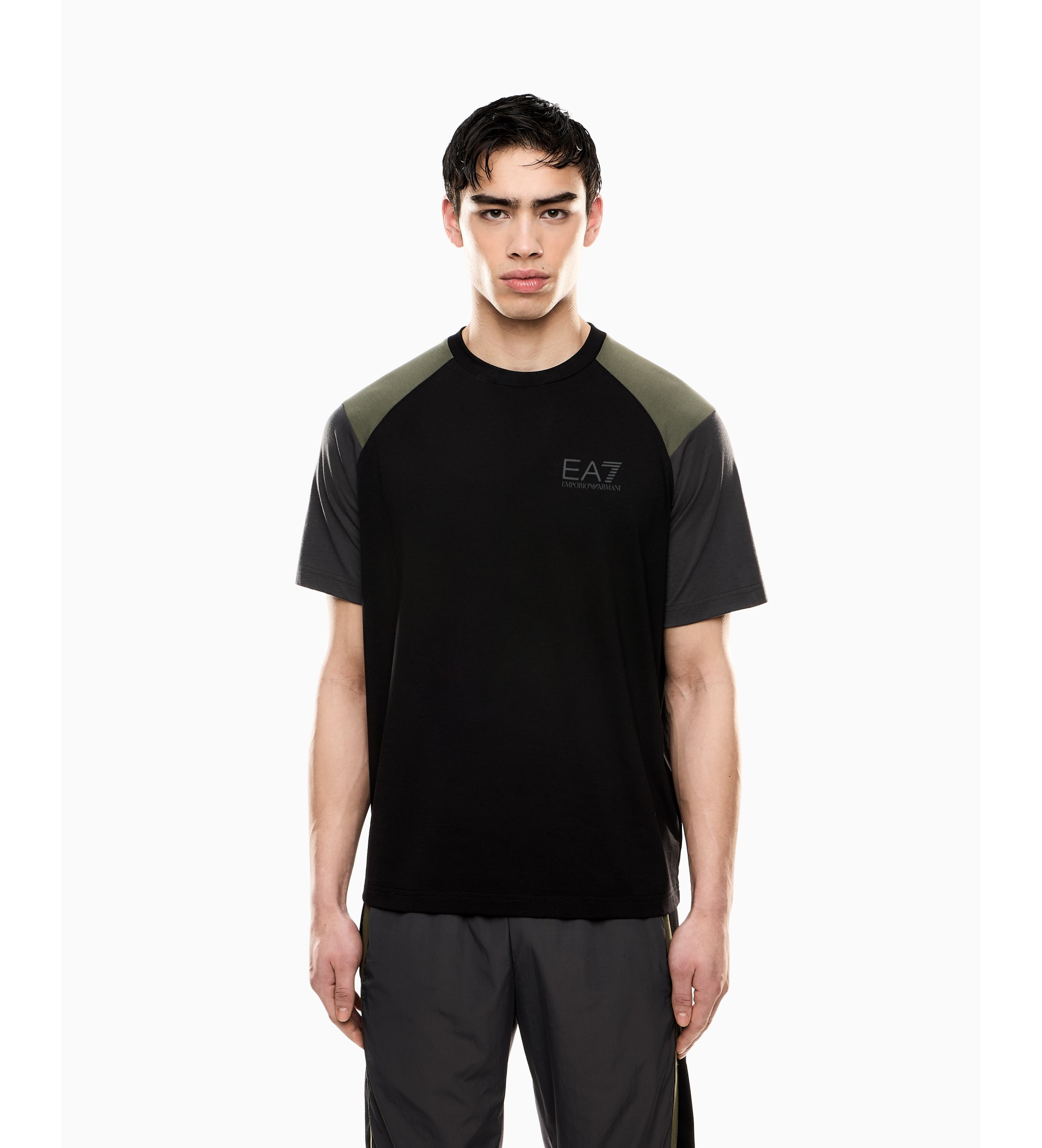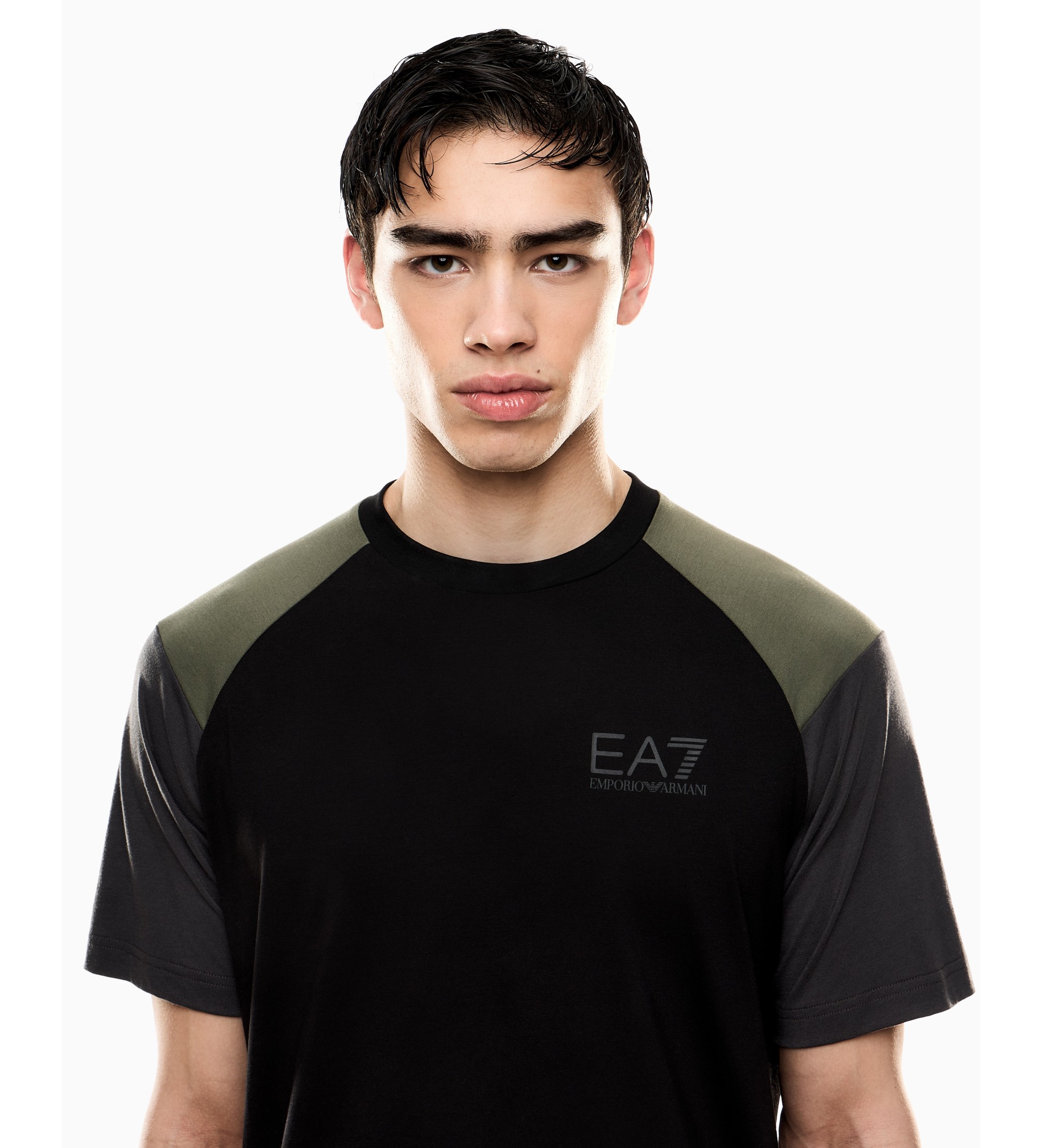 Simple lines and a colour block effect characterise the sleeves of this crew neck T-shirt in soft organic cotton blend fabric, with a fresh, youthful spirit. The model is personalised with the EA7 logo on the chest, completing it with distinction. The piece is part of the Athletic Color Block line, an urban-inspired offering of young and dynamic pieces, characterised by a modern and bold colour palette.