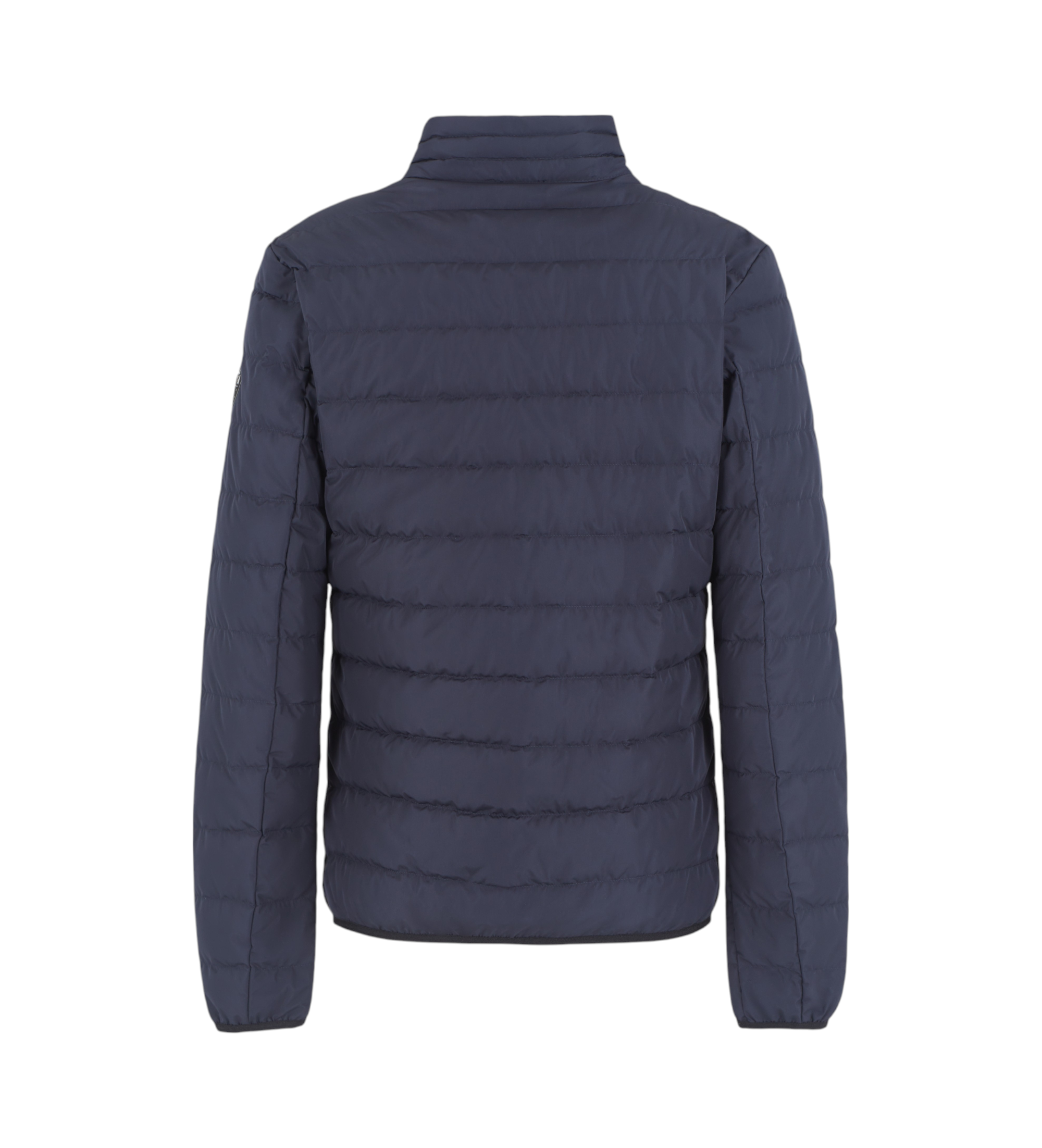 This down jacket combines goose feather filling with technical fabric to create a warm and versatile garment, ideal for sports and leisure. The model features a front zip fastening and two practical side pockets, and is personalised with a logo shield patch. The garment is embellished with the new quilted chevron-effect quilted motif and can be easily folded into its pouch.