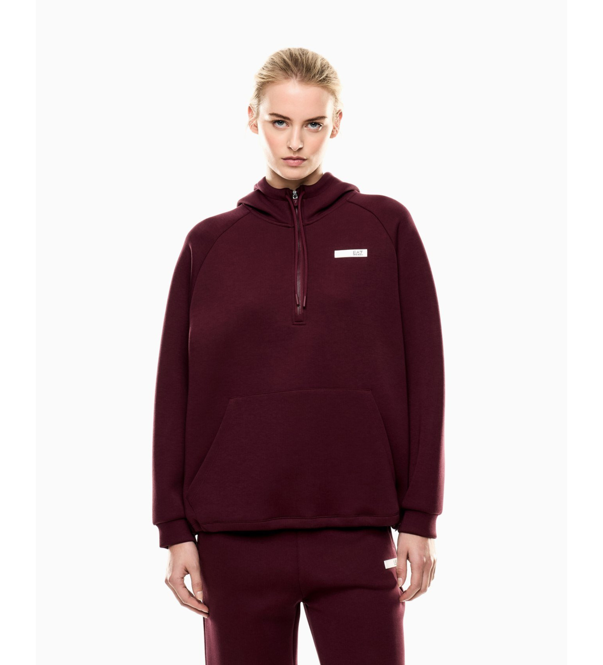 Comfortable sweatshirt with drawstring hood and three-quarter zip fastening, personalised with contrasting logo patch on the chest. The model is characterised by the logo tape on the back and is made from the innovative Natural VENTUS7 technical fabric, a blend of natural and synthetic fibres that regulates body temperature, expelling sweat as water vapour while leaving a comfortable, soft feel on the skin thanks to the cotton fibres in its composition.